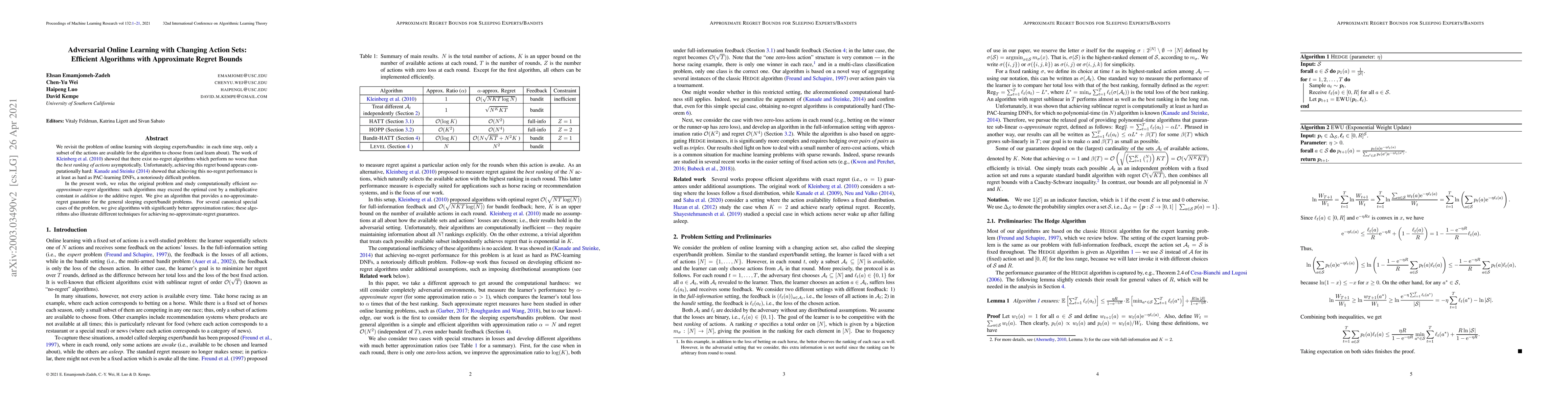 This paper proposes efficient algorithms for online learning with changing action sets, offering no-approximate-regret guarantees rather than strict no-regret, addressing the computational difficulty of achieving optimal performance. It introduces algorithms with improved approximation ratios for specific cases, demonstrating practical techniques for handling dynamic action availability.