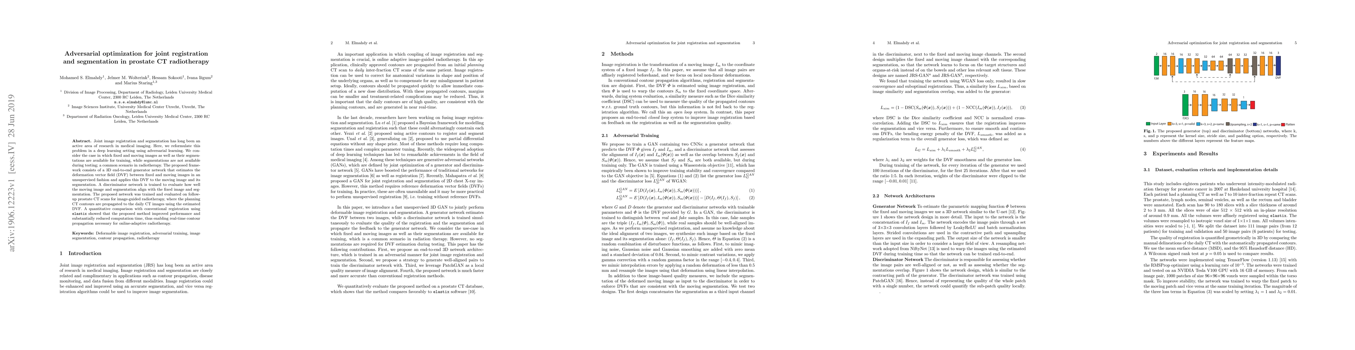 Joint image registration and segmentation has long been an active area of research in medical imaging. Here, we reformulate this problem in a deep learning setting using adversarial learning. We consider the case in which fixed and moving images as well as their segmentations are available for training, while segmentations are not available during testing; a common scenario in radiotherapy. The proposed framework consists of a 3D end-to-end generator network that estimates the deformation vector field (DVF) between fixed and moving images in an unsupervised fashion and applies this DVF to the moving image and its segmentation. A discriminator network is trained to evaluate how well the moving image and segmentation align with the fixed image and segmentation. The proposed network was trained and evaluated on follow-up prostate CT scans for image-guided radiotherapy, where the planning CT contours are propagated to the daily CT images using the estimated DVF. A quantitative comparison with conventional registration using \texttt{elastix} showed that the proposed method improved performance and substantially reduced computation time, thus enabling real-time contour propagation necessary for online-adaptive radiotherapy.