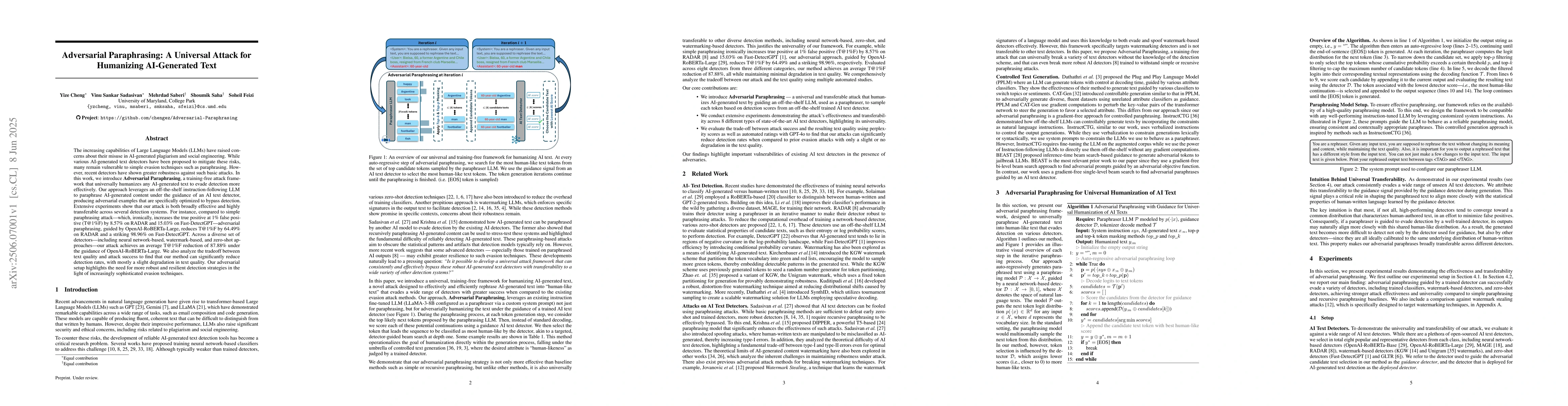 Researchers introduce Adversarial Paraphrasing, a training-free attack framework that universally humanizes AI-generated text to evade detection more effectively, reducing detection rates by up to 98.96%.