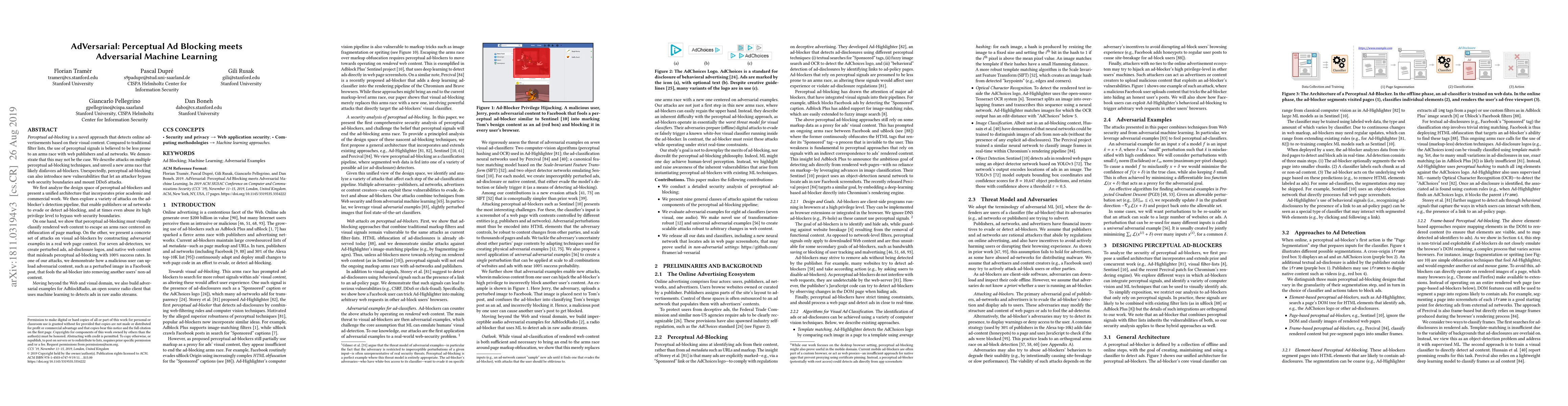 This paper investigates perceptual ad-blocking techniques, which detect ads based on visual content, and reveals that they are vulnerable to adversarial attacks. The authors demonstrate how these techniques can be exploited to evade detection, leading to a new arms race, and even to bypass web security boundaries, including launching DDoS attacks.