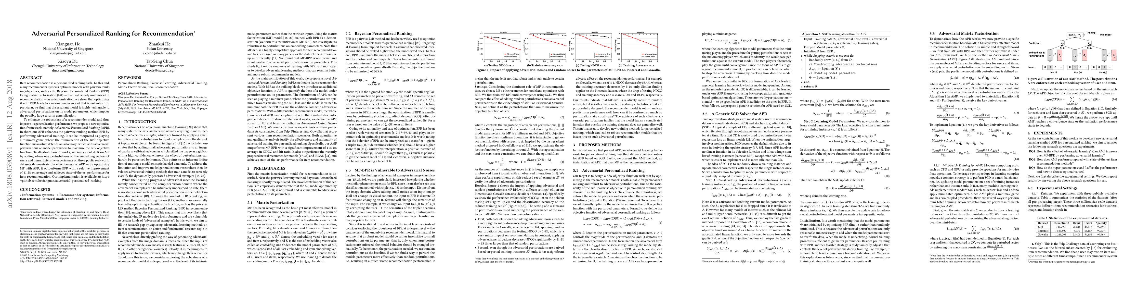 The paper proposes Adversarial Personalized Ranking (APR) to enhance the robustness of recommender systems, especially matrix factorization models optimized with Bayesian Personalized Ranking (BPR). APR incorporates adversarial training to defend against perturbations, resulting in improved generalization performance and outperforming BPR by 11.2% on average across three datasets.