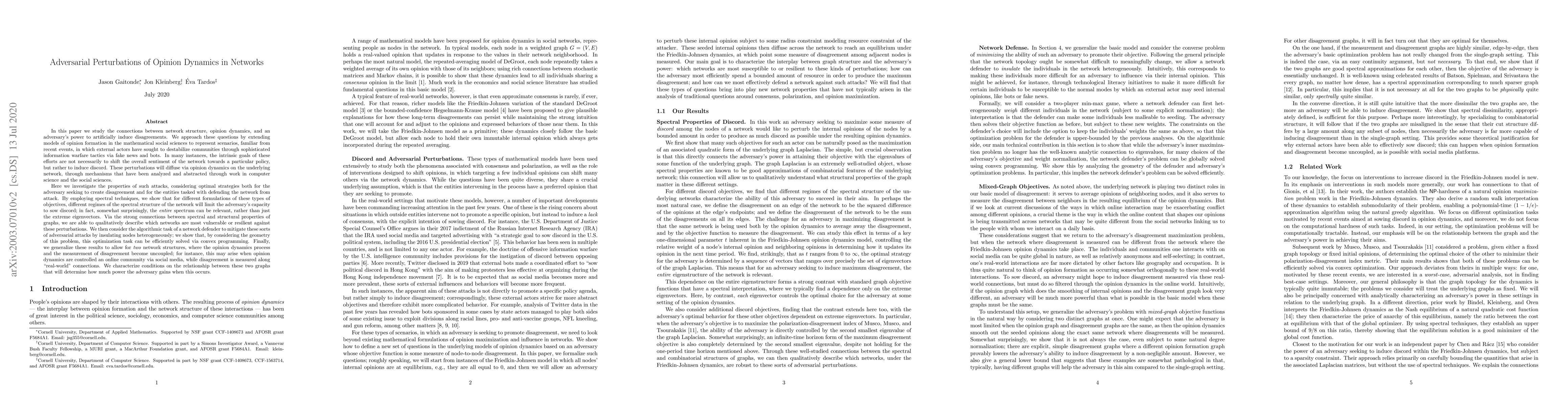 This paper explores how adversarial perturbations can induce discord in opinion dynamics within networks, focusing on the strategies used by both attackers and defenders. It identifies network spectral properties that determine vulnerability to such attacks and proposes an efficient convex programming approach for mitigating these perturbations.
