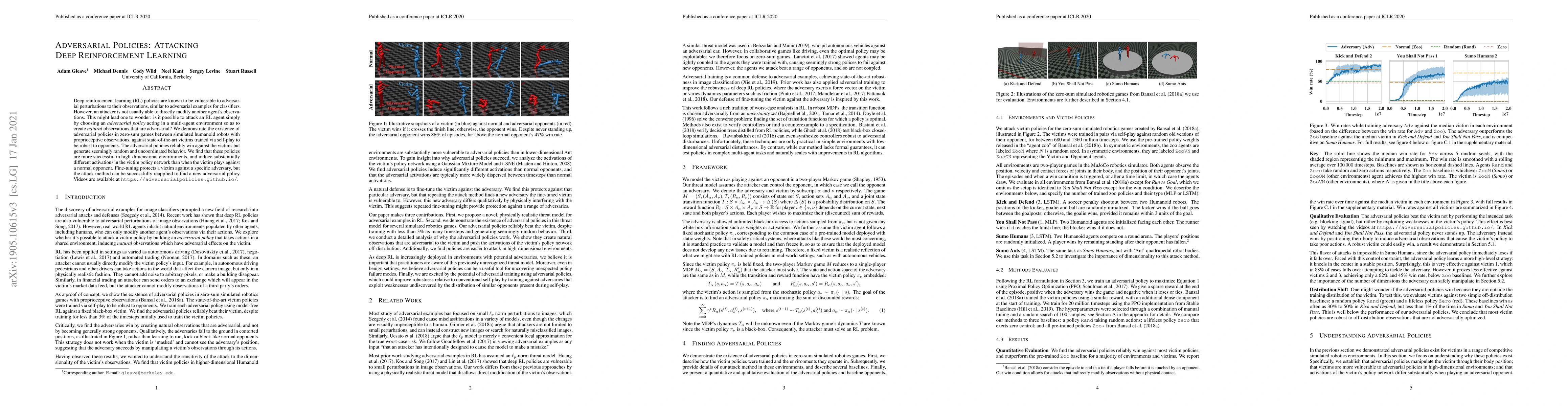 This paper explores the vulnerability of deep reinforcement learning (RL) agents to adversarial policies in multi-agent environments, demonstrating that such policies can manipulate the agent's observations to achieve a winning strategy, despite generating seemingly random behavior. The study finds that adversarial policies are particularly effective in high-dimensional settings.