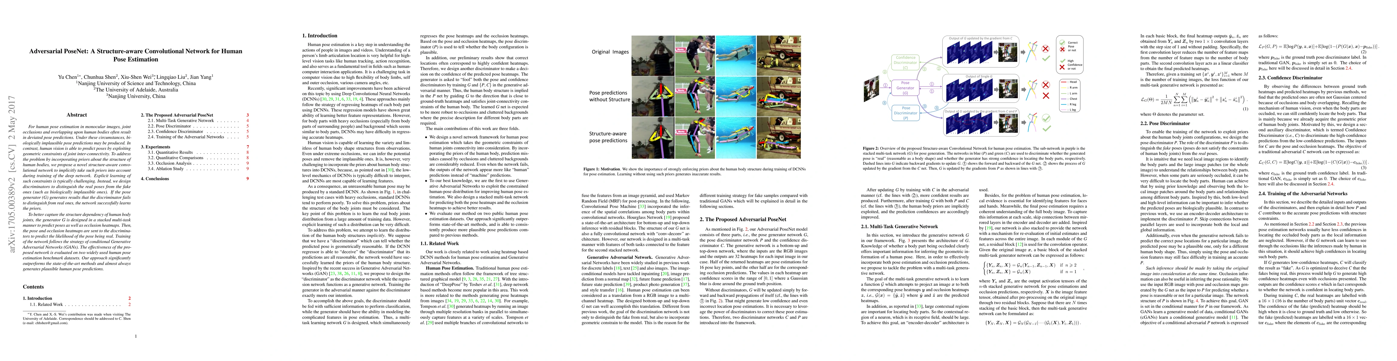 Adversarial PoseNet introduces a structure-aware convolutional network for human pose estimation that leverages geometric constraints through adversarial training, helping to generate biologically plausible poses even under occlusion and overlap. The approach uses discriminators to teach the network by distinguishing realistic poses from implausible ones.