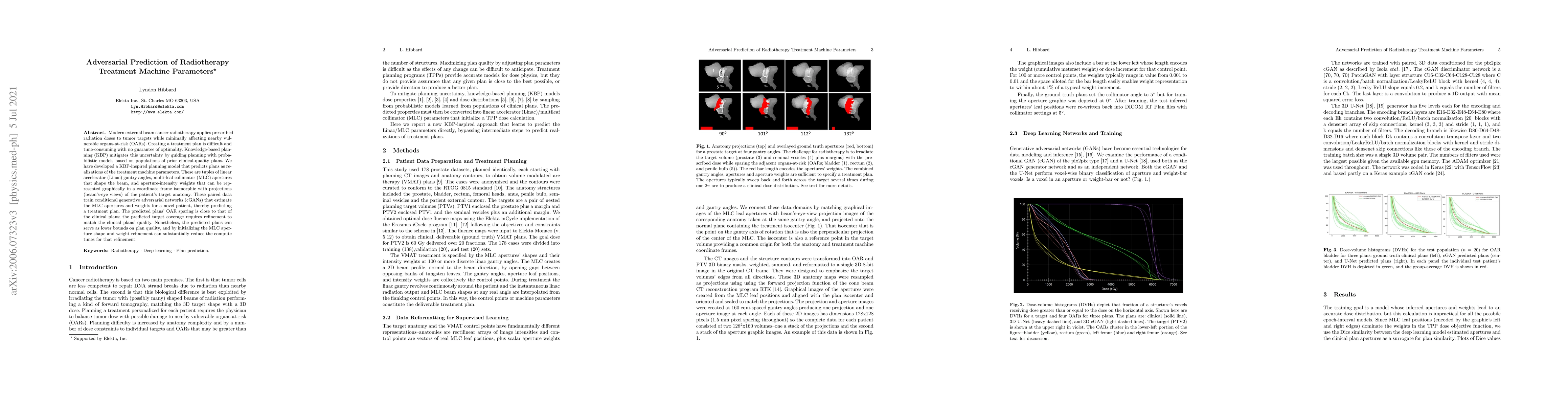 Modern external beam cancer radiotherapy applies prescribed radiation doses to tumor targets while minimally affecting nearby vulnerable organs-at-risk (OARs). Creating a treatment plan is difficult and time-consuming with no guarantee of optimality. Knowledge-based planning (KBP) mitigates this uncertainty by guiding planning with probabilistic models based on populations of prior clinical-quality plans. We have developed a KBP-inspired planning model that predicts plans as realizations of the treatment machine parameters. These are tuples of linear accelerator (Linac) gantry angles, multi-leaf collimator (MLC) apertures that shape the beam, and aperture-intensity weights that can be represented graphically in a coordinate frame isomorphic with projections (beam's-eye views) of the patient's target anatomy. These paired data train conditional generative adversarial networks (cGANs) that estimate the MLC apertures and weights for a novel patient, thereby predicting a treatment plan. The predicted plans' OAR sparing is close to that of the clinical plans; the predicted target coverage requires refinement to match the clinical plans' quality. Nonetheless, the predicted plans can serve as lower bounds on plan quality, and by initializing the MLC aperture shape and weight refinement can substantially reduce the compute times for that refinement.