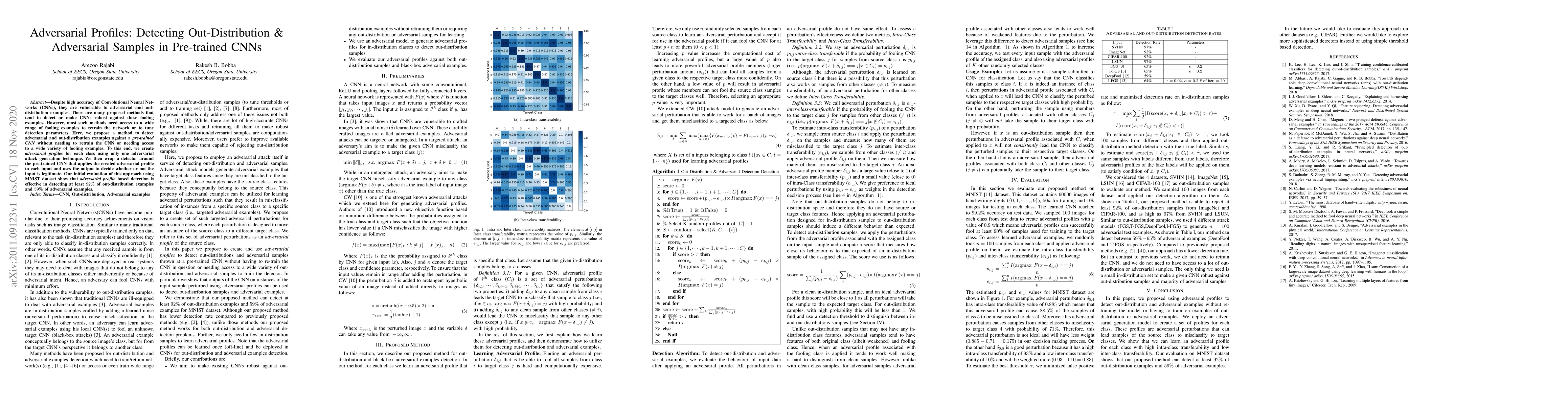 This paper proposes a method for detecting adversarial and out-distribution samples in pre-trained CNNs without retraining or requiring a wide range of fooling examples. It creates adversarial profiles for each class using a single attack technique and employs a detector that uses these profiles to identify illegitimate inputs. Initial results on the MNIST dataset show effective detection rates for out-distribution and adversarial examples.