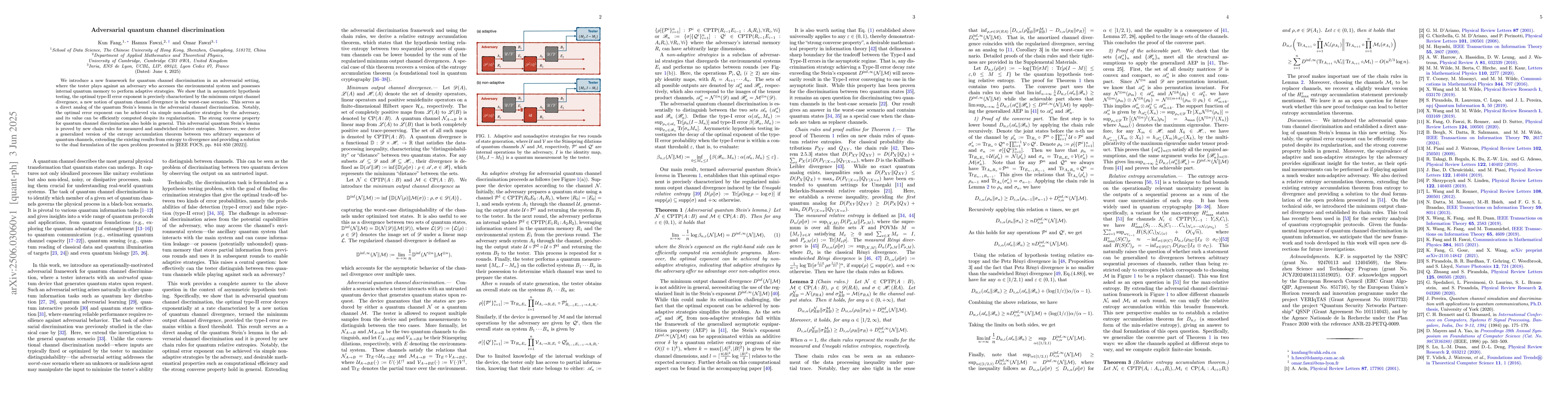 Researchers introduce a framework for quantum channel discrimination in an adversarial setting, showing that the optimal error exponent is linked to the minimum output channel divergence, and derive a generalized version of the entropy accumulation theorem for arbitrary sequences of quantum channels.