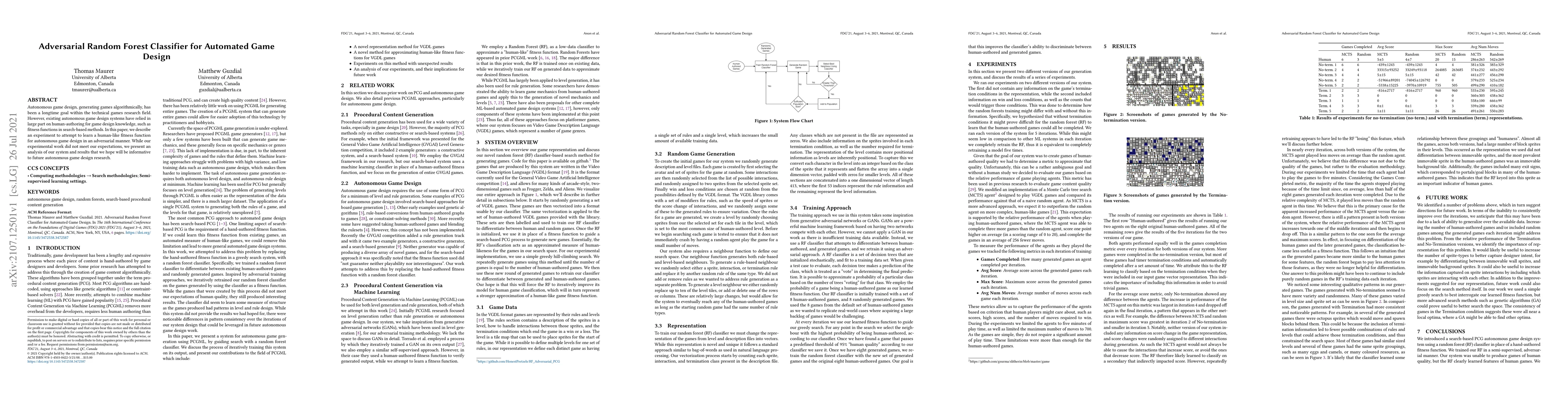 Researchers developed an adversarial random forest classifier to learn human-like fitness functions for autonomous game design, but their experimental results fell short of expectations. The study provides insight into the challenges of creating intelligent game design systems.