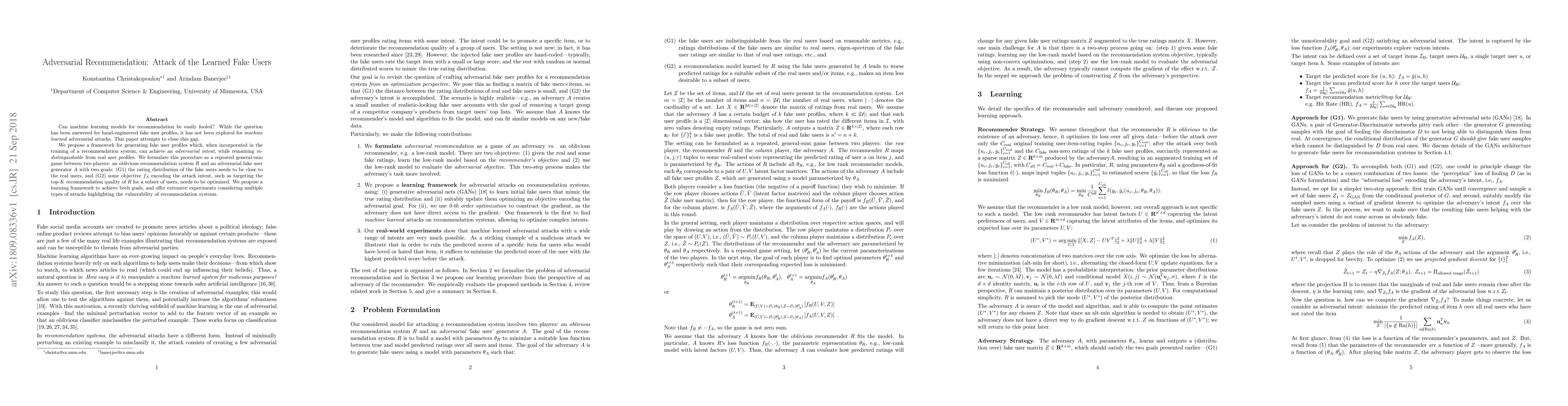 Can machine learning models for recommendation be easily fooled? While the question has been answered for hand-engineered fake user profiles, it has not been explored for machine learned adversarial attacks. This paper attempts to close this gap. We propose a framework for generating fake user profiles which, when incorporated in the training of a recommendation system, can achieve an adversarial intent, while remaining indistinguishable from real user profiles. We formulate this procedure as a repeated general-sum game between two players: an oblivious recommendation system $R$ and an adversarial fake user generator $A$ with two goals: (G1) the rating distribution of the fake users needs to be close to the real users, and (G2) some objective $f_A$ encoding the attack intent, such as targeting the top-K recommendation quality of $R$ for a subset of users, needs to be optimized. We propose a learning framework to achieve both goals, and offer extensive experiments considering multiple types of attacks highlighting the vulnerability of recommendation systems.