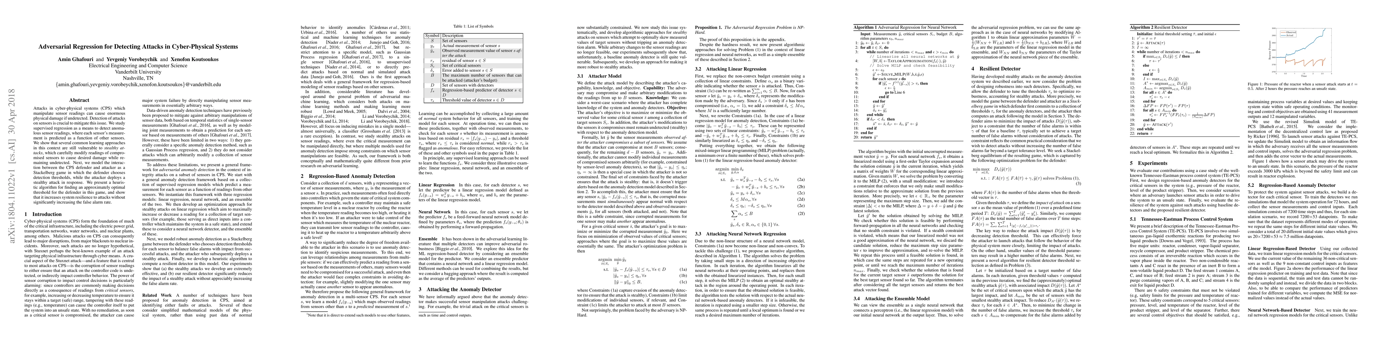 This work is novel in its approach to modeling the interaction between defender and attacker in a CPS context as a Stackelberg game and in presenting a heuristic algorithm to tackle the NP-hard adversarial regression problem.