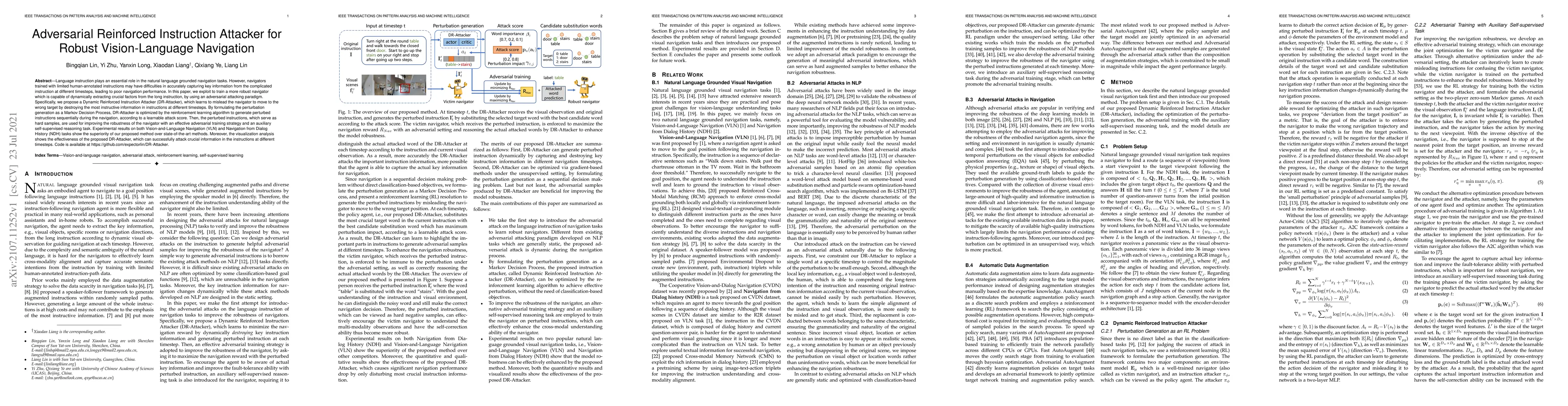 This paper proposes a Dynamic Reinforced Instruction Attacker (DR-Attacker) to enhance the robustness of vision-language navigation systems. DR-Attacker employs an adversarial approach to mislead navigators by removing crucial information from instructions, thereby improving the system's resilience through adversarial training and self-supervised reasoning.