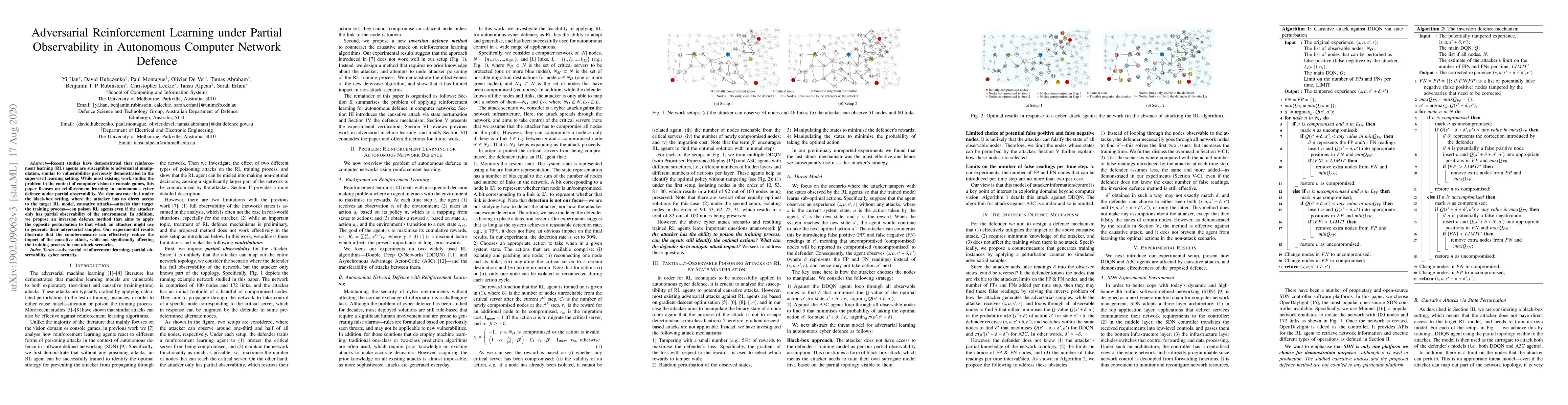 Recent studies have demonstrated that reinforcement learning (RL) agents are susceptible to adversarial manipulation, similar to vulnerabilities previously demonstrated in the supervised learning setting. While most existing work studies the problem in the context of computer vision or console games, this paper focuses on reinforcement learning in autonomous cyber defence under partial observability. We demonstrate that under the black-box setting, where the attacker has no direct access to the target RL model, causative attacks---attacks that target the training process---can poison RL agents even if the attacker only has partial observability of the environment. In addition, we propose an inversion defence method that aims to apply the opposite perturbation to that which an attacker might use to generate their adversarial samples. Our experimental results illustrate that the countermeasure can effectively reduce the impact of the causative attack, while not significantly affecting the training process in non-attack scenarios.