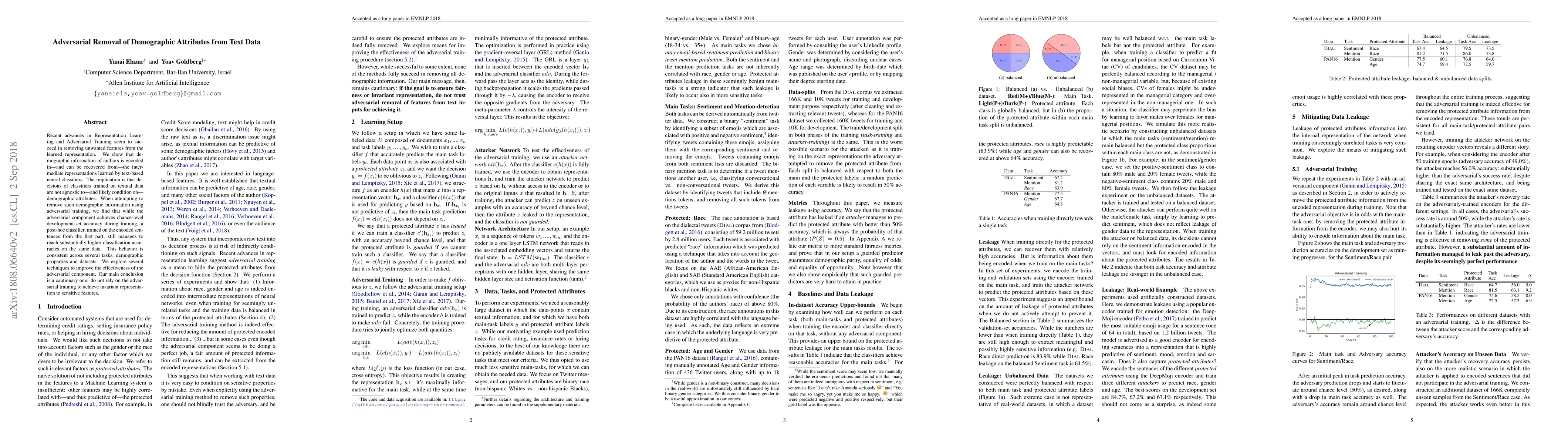 Recent advances in Representation Learning and Adversarial Training seem to succeed in removing unwanted features from the learned representation. We show that demographic information of authors is encoded in -- and can be recovered from -- the intermediate representations learned by text-based neural classifiers. The implication is that decisions of classifiers trained on textual data are not agnostic to -- and likely condition on -- demographic attributes. When attempting to remove such demographic information using adversarial training, we find that while the adversarial component achieves chance-level development-set accuracy during training, a post-hoc classifier, trained on the encoded sentences from the first part, still manages to reach substantially higher classification accuracies on the same data. This behavior is consistent across several tasks, demographic properties and datasets. We explore several techniques to improve the effectiveness of the adversarial component. Our main conclusion is a cautionary one: do not rely on the adversarial training to achieve invariant representation to sensitive features.