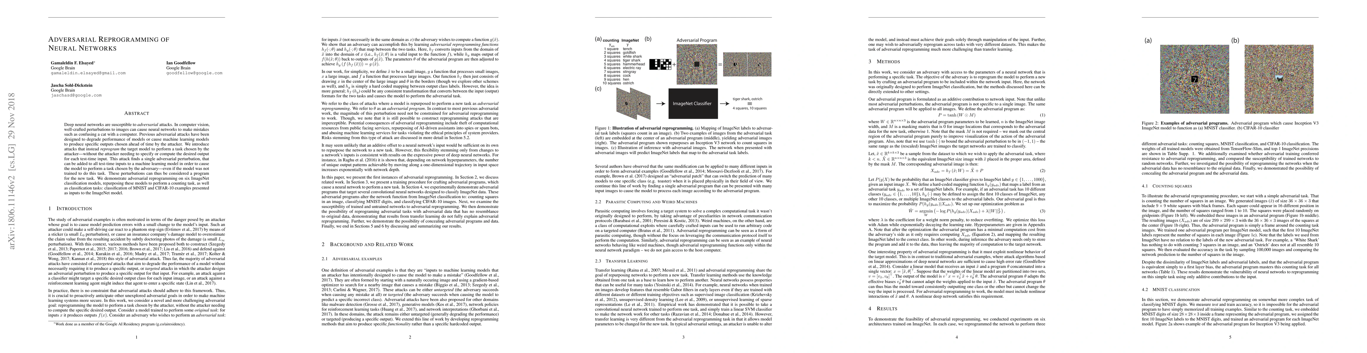 This paper introduces a novel adversarial attack that reprograms neural networks to perform tasks chosen by the attacker without specifying desired outputs for each input. The attack finds a single perturbation that can be applied to any input to achieve the new task, demonstrating its effectiveness on ImageNet classification models repurposed for counting and other classification tasks.