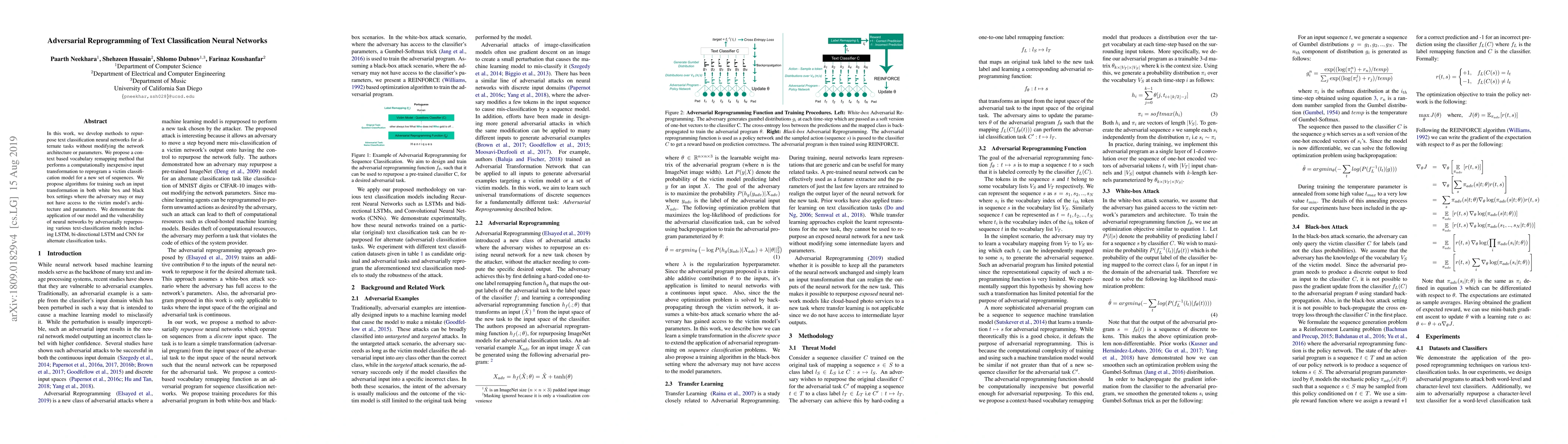 This paper introduces a context-based vocabulary remapping model to reprogram neural networks originally trained for text classification tasks for new classification objectives. The model is demonstrated to work in both white-box and black-box scenarios, successfully repurposing models like LSTM, bi-directional LSTM, and CNN for alternate text classification tasks.
