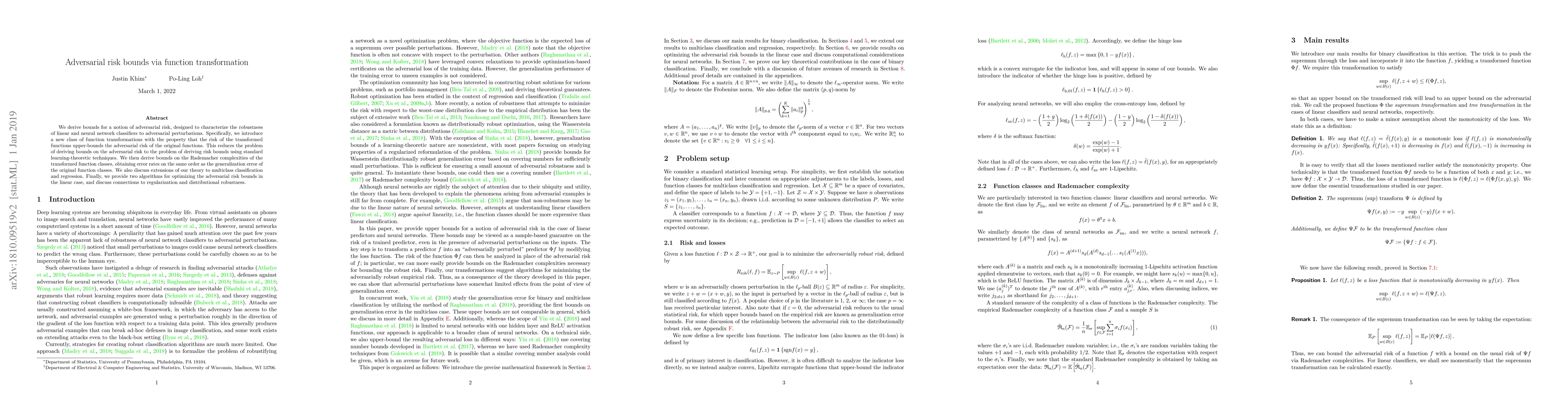 This paper provides bounds for adversarial risk in linear and neural network classifiers, introducing a new class of function transformations that upper-bound adversarial risk. It derives Rademacher complexity bounds for these transformations, achieving error rates comparable to the generalization error, and discusses extensions to multiclass and regression problems.