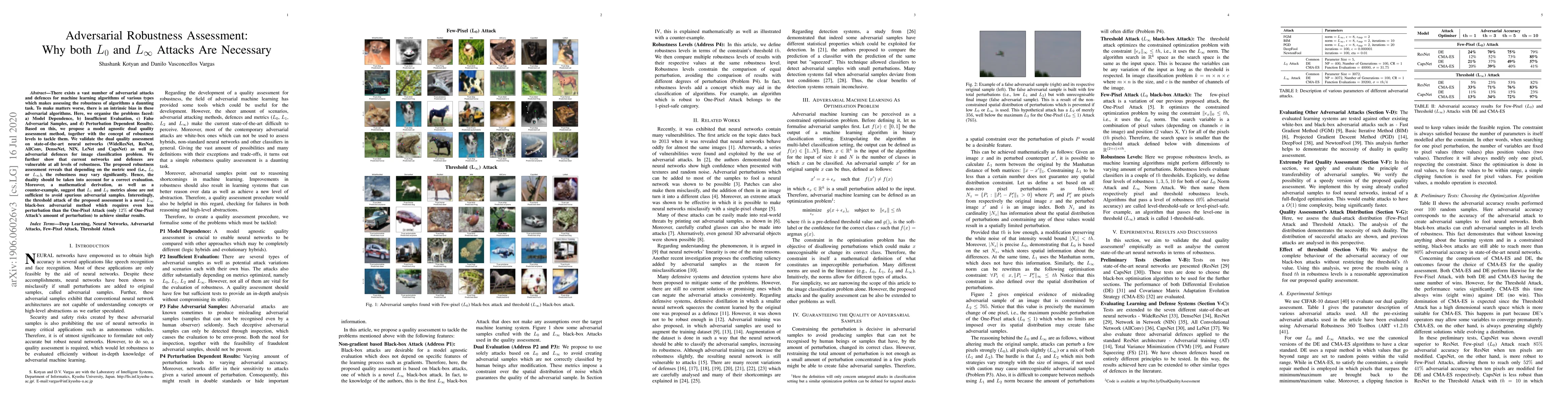 There exists a vast number of adversarial attacks and defences for machine learning algorithms of various types which makes assessing the robustness of algorithms a daunting task. To make matters worse, there is an intrinsic bias in these adversarial algorithms. Here, we organise the problems faced: a) Model Dependence, b) Insufficient Evaluation, c) False Adversarial Samples, and d) Perturbation Dependent Results). Based on this, we propose a model agnostic dual quality assessment method, together with the concept of robustness levels to tackle them. We validate the dual quality assessment on state-of-the-art neural networks (WideResNet, ResNet, AllConv, DenseNet, NIN, LeNet and CapsNet) as well as adversarial defences for image classification problem. We further show that current networks and defences are vulnerable at all levels of robustness. The proposed robustness assessment reveals that depending on the metric used (i.e., $L_0$ or $L_\infty$), the robustness may vary significantly. Hence, the duality should be taken into account for a correct evaluation. Moreover, a mathematical derivation, as well as a counter-example, suggest that $L_1$ and $L_2$ metrics alone are not sufficient to avoid spurious adversarial samples. Interestingly, the threshold attack of the proposed assessment is a novel $L_\infty$ black-box adversarial method which requires even less perturbation than the One-Pixel Attack (only $12\%$ of One-Pixel Attack's amount of perturbation) to achieve similar results. Code is available at http://bit.ly/DualQualityAssessment.