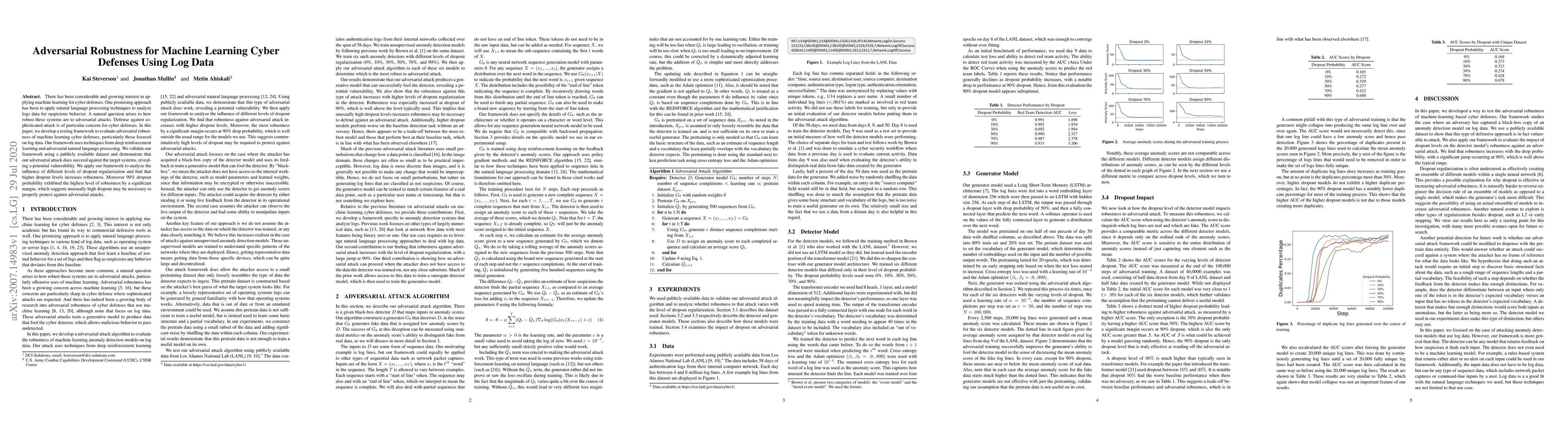 There has been considerable and growing interest in applying machine learning for cyber defenses. One promising approach has been to apply natural language processing techniques to analyze logs data for suspicious behavior. A natural question arises to how robust these systems are to adversarial attacks. Defense against sophisticated attack is of particular concern for cyber defenses. In this paper, we develop a testing framework to evaluate adversarial robustness of machine learning cyber defenses, particularly those focused on log data. Our framework uses techniques from deep reinforcement learning and adversarial natural language processing. We validate our framework using a publicly available dataset and demonstrate that our adversarial attack does succeed against the target systems, revealing a potential vulnerability. We apply our framework to analyze the influence of different levels of dropout regularization and find that higher dropout levels increases robustness. Moreover 90% dropout probability exhibited the highest level of robustness by a significant margin, which suggests unusually high dropout may be necessary to properly protect against adversarial attacks.