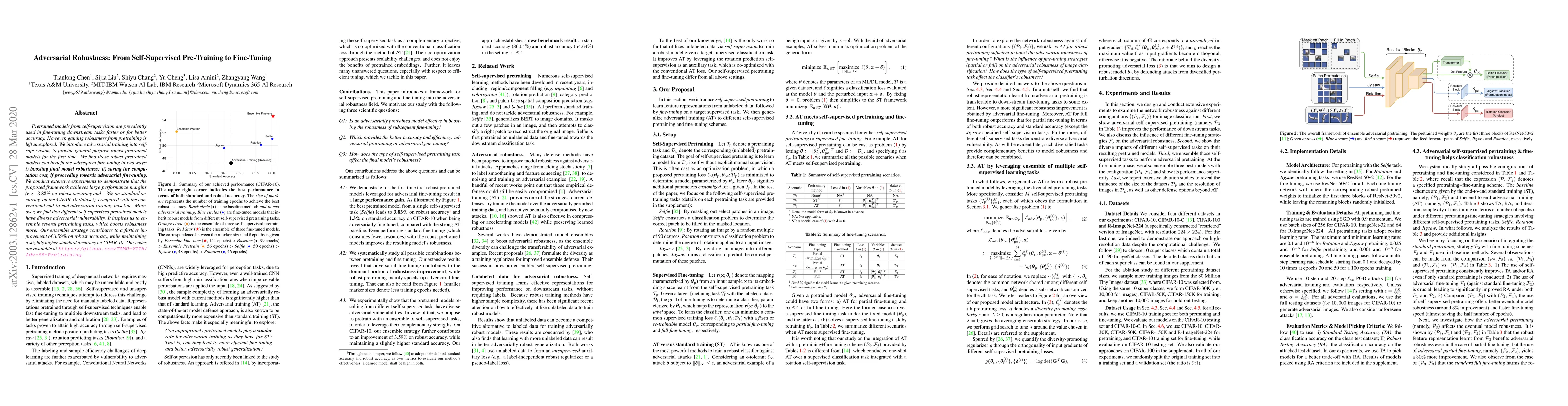 Pretrained models from self-supervision are prevalently used in fine-tuning downstream tasks faster or for better accuracy. However, gaining robustness from pretraining is left unexplored. We introduce adversarial training into self-supervision, to provide general-purpose robust pre-trained models for the first time. We find these robust pre-trained models can benefit the subsequent fine-tuning in two ways: i) boosting final model robustness; ii) saving the computation cost, if proceeding towards adversarial fine-tuning. We conduct extensive experiments to demonstrate that the proposed framework achieves large performance margins (eg, 3.83% on robust accuracy and 1.3% on standard accuracy, on the CIFAR-10 dataset), compared with the conventional end-to-end adversarial training baseline. Moreover, we find that different self-supervised pre-trained models have a diverse adversarial vulnerability. It inspires us to ensemble several pretraining tasks, which boosts robustness more. Our ensemble strategy contributes to a further improvement of 3.59% on robust accuracy, while maintaining a slightly higher standard accuracy on CIFAR-10. Our codes are available at https://github.com/TAMU-VITA/Adv-SS-Pretraining.