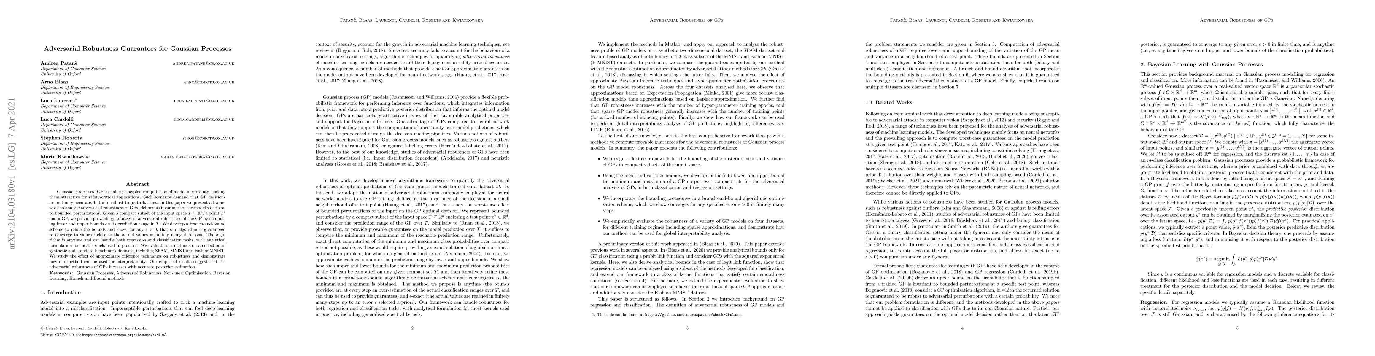 Gaussian processes (GPs) enable principled computation of model uncertainty, making them attractive for safety-critical applications. Such scenarios demand that GP decisions are not only accurate, but also robust to perturbations. In this paper we present a framework to analyse adversarial robustness of GPs, defined as invariance of the model's decision to bounded perturbations. Given a compact subset of the input space $T\subseteq \mathbb{R}^d$, a point $x^*$ and a GP, we provide provable guarantees of adversarial robustness of the GP by computing lower and upper bounds on its prediction range in $T$. We develop a branch-and-bound scheme to refine the bounds and show, for any $\epsilon > 0$, that our algorithm is guaranteed to converge to values $\epsilon$-close to the actual values in finitely many iterations. The algorithm is anytime and can handle both regression and classification tasks, with analytical formulation for most kernels used in practice. We evaluate our methods on a collection of synthetic and standard benchmark datasets, including SPAM, MNIST and FashionMNIST. We study the effect of approximate inference techniques on robustness and demonstrate how our method can be used for interpretability. Our empirical results suggest that the adversarial robustness of GPs increases with accurate posterior estimation.