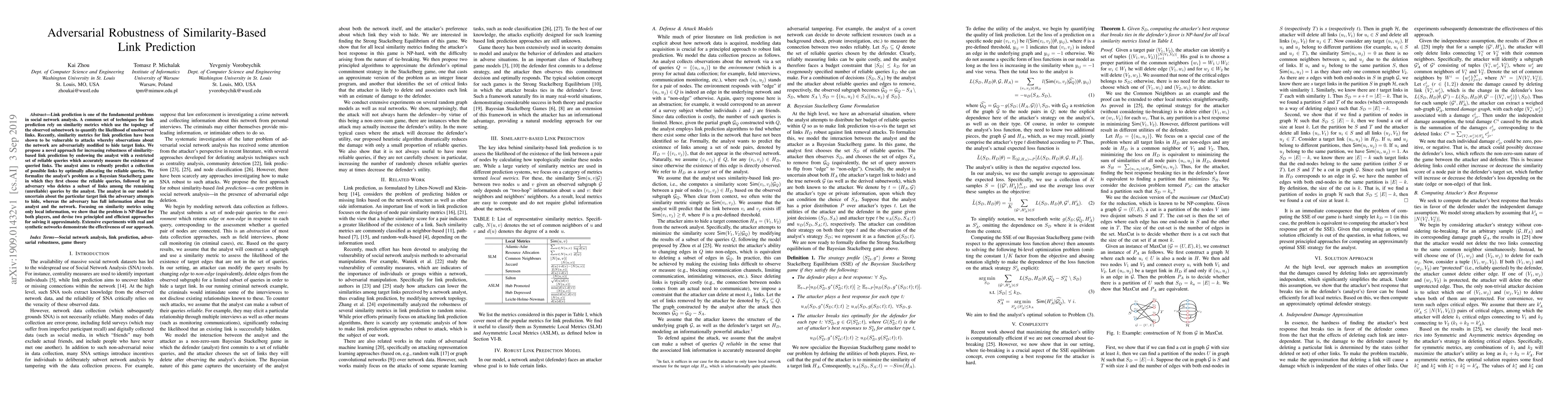 This paper proposes a novel method to enhance the robustness of similarity-based link prediction in social networks against adversarial attacks. It formulates the problem as a Bayesian Stackelberg game and presents two efficient approaches to solve it approximately, demonstrating their effectiveness through experiments on real and synthetic networks.