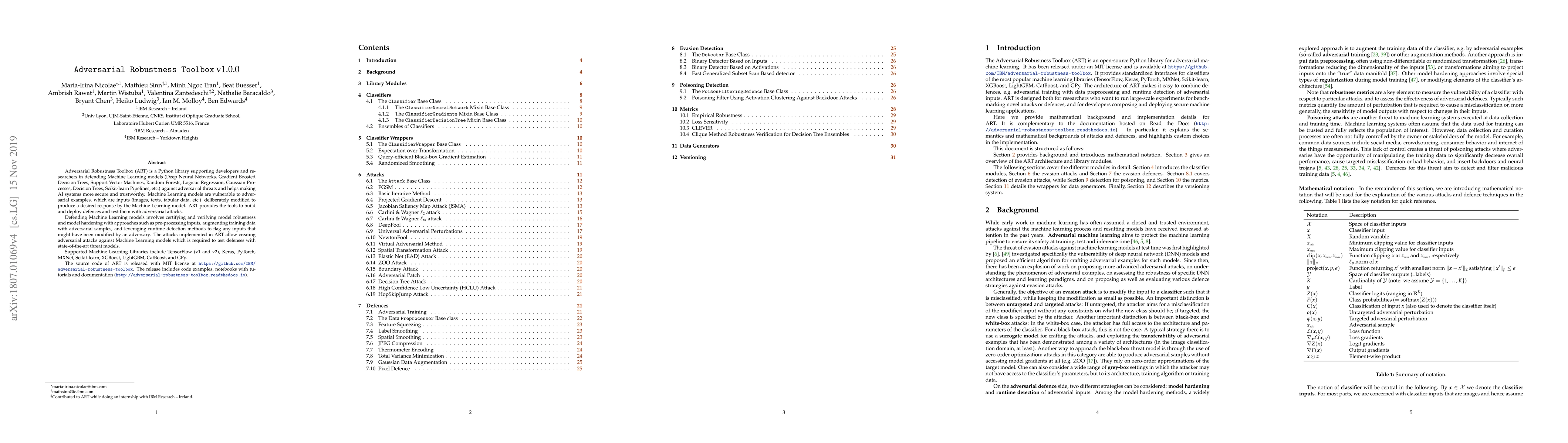 Adversarial Robustness Toolbox (ART) is a Python library supporting developers and researchers in defending Machine Learning models (Deep Neural Networks, Gradient Boosted Decision Trees, Support Vector Machines, Random Forests, Logistic Regression, Gaussian Processes, Decision Trees, Scikit-learn Pipelines, etc.) against adversarial threats and helps making AI systems more secure and trustworthy. Machine Learning models are vulnerable to adversarial examples, which are inputs (images, texts, tabular data, etc.) deliberately modified to produce a desired response by the Machine Learning model. ART provides the tools to build and deploy defences and test them with adversarial attacks. Defending Machine Learning models involves certifying and verifying model robustness and model hardening with approaches such as pre-processing inputs, augmenting training data with adversarial samples, and leveraging runtime detection methods to flag any inputs that might have been modified by an adversary. The attacks implemented in ART allow creating adversarial attacks against Machine Learning models which is required to test defenses with state-of-the-art threat models. Supported Machine Learning Libraries include TensorFlow (v1 and v2), Keras, PyTorch, MXNet, Scikit-learn, XGBoost, LightGBM, CatBoost, and GPy. The source code of ART is released with MIT license at https://github.com/IBM/adversarial-robustness-toolbox. The release includes code examples, notebooks with tutorials and documentation (http://adversarial-robustness-toolbox.readthedocs.io).