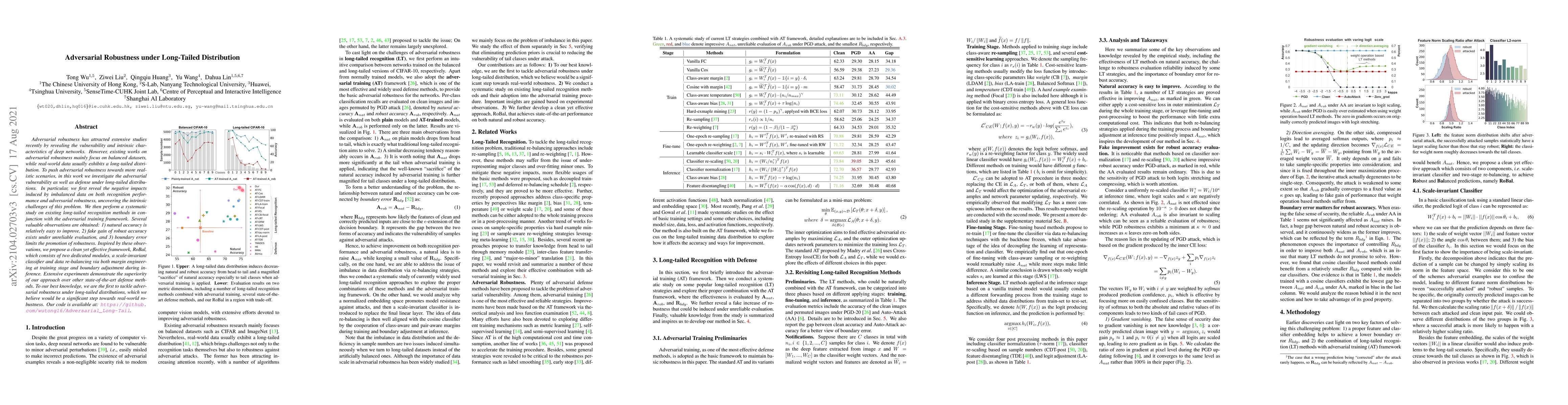 Adversarial robustness has attracted extensive studies recently by revealing the vulnerability and intrinsic characteristics of deep networks. However, existing works on adversarial robustness mainly focus on balanced datasets, while real-world data usually exhibits a long-tailed distribution. To push adversarial robustness towards more realistic scenarios, in this work we investigate the adversarial vulnerability as well as defense under long-tailed distributions. In particular, we first reveal the negative impacts induced by imbalanced data on both recognition performance and adversarial robustness, uncovering the intrinsic challenges of this problem. We then perform a systematic study on existing long-tailed recognition methods in conjunction with the adversarial training framework. Several valuable observations are obtained: 1) natural accuracy is relatively easy to improve, 2) fake gain of robust accuracy exists under unreliable evaluation, and 3) boundary error limits the promotion of robustness. Inspired by these observations, we propose a clean yet effective framework, RoBal, which consists of two dedicated modules, a scale-invariant classifier and data re-balancing via both margin engineering at training stage and boundary adjustment during inference. Extensive experiments demonstrate the superiority of our approach over other state-of-the-art defense methods. To our best knowledge, we are the first to tackle adversarial robustness under long-tailed distributions, which we believe would be a significant step towards real-world robustness. Our code is available at: https://github.com/wutong16/Adversarial_Long-Tail .