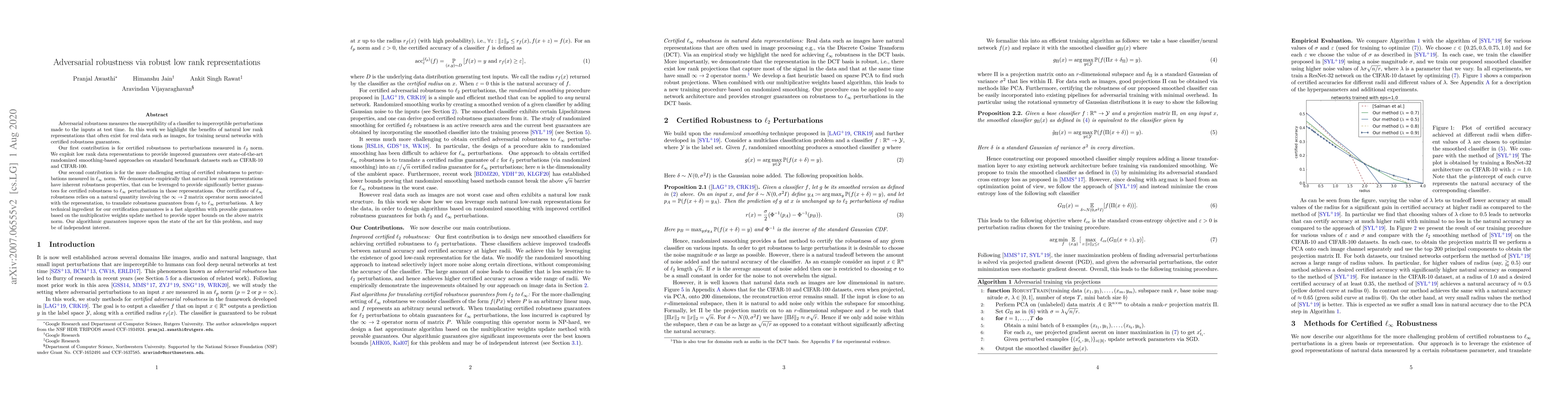 This paper explores leveraging natural low rank representations to enhance the adversarial robustness of neural networks, providing certified robustness guarantees for both $\ell_2$ and $\ell_\infty$ perturbations. It presents improved methods for $\ell_2$ robustness using low rank data representations and demonstrates significant enhancements for $\ell_\infty$ robustness through a novel matrix norm-based approach.