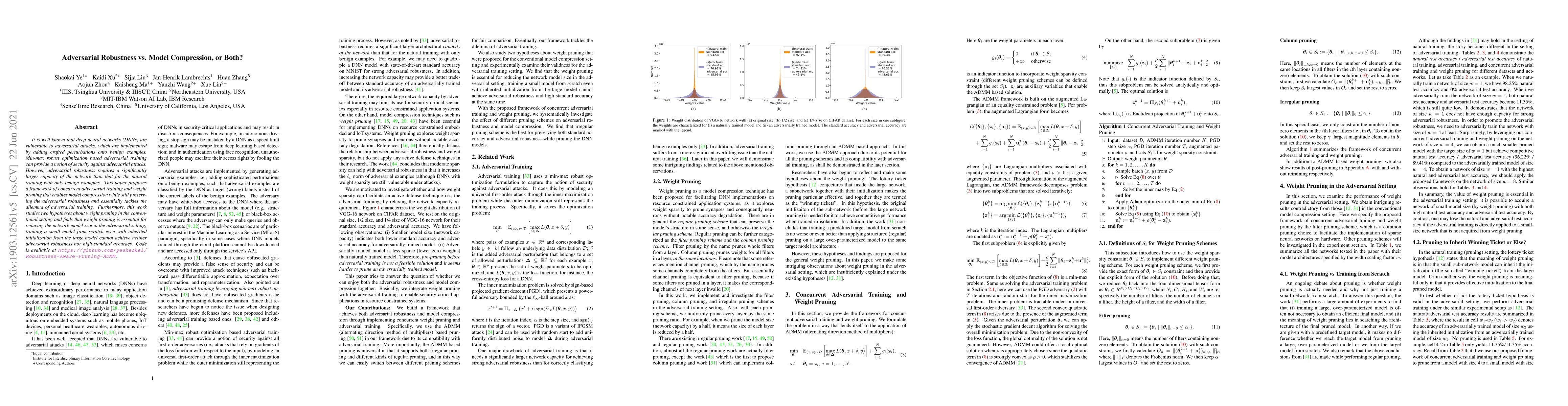 This paper proposes a framework for concurrently training deep neural networks using adversarial examples and applying weight pruning to achieve model compression while maintaining adversarial robustness. It finds that weight pruning is crucial for achieving both robustness and efficiency, and training a small model from scratch does not suffice.