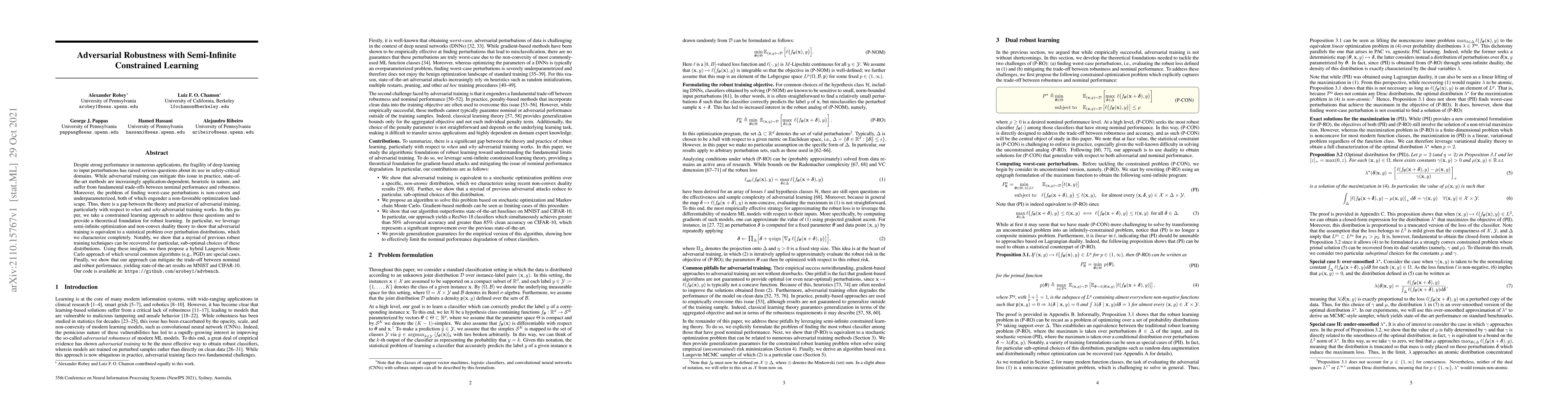 Despite strong performance in numerous applications, the fragility of deep learning to input perturbations has raised serious questions about its use in safety-critical domains. While adversarial training can mitigate this issue in practice, state-of-the-art methods are increasingly application-dependent, heuristic in nature, and suffer from fundamental trade-offs between nominal performance and robustness. Moreover, the problem of finding worst-case perturbations is non-convex and underparameterized, both of which engender a non-favorable optimization landscape. Thus, there is a gap between the theory and practice of adversarial training, particularly with respect to when and why adversarial training works. In this paper, we take a constrained learning approach to address these questions and to provide a theoretical foundation for robust learning. In particular, we leverage semi-infinite optimization and non-convex duality theory to show that adversarial training is equivalent to a statistical problem over perturbation distributions, which we characterize completely. Notably, we show that a myriad of previous robust training techniques can be recovered for particular, sub-optimal choices of these distributions. Using these insights, we then propose a hybrid Langevin Monte Carlo approach of which several common algorithms (e.g., PGD) are special cases. Finally, we show that our approach can mitigate the trade-off between nominal and robust performance, yielding state-of-the-art results on MNIST and CIFAR-10. Our code is available at: https://github.com/arobey1/advbench.