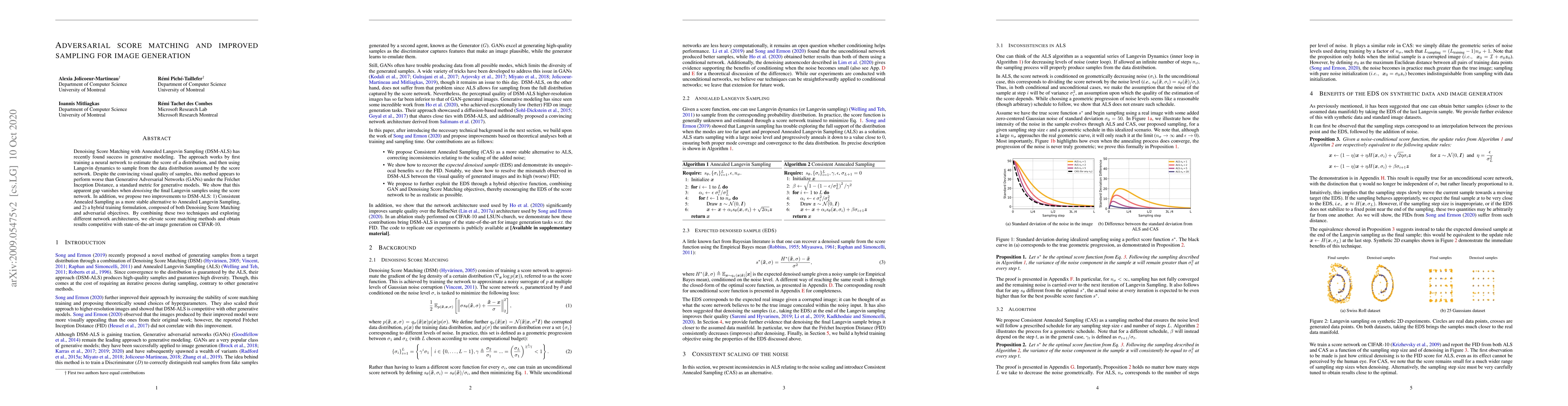 This paper enhances Denoising Score Matching with Annealed Langevin Sampling (DSM-ALS) by denoising final samples and introducing Consistent Annealed Sampling and a hybrid training approach combining score matching and adversarial objectives, achieving competitive results with GANs on CIFAR-10.