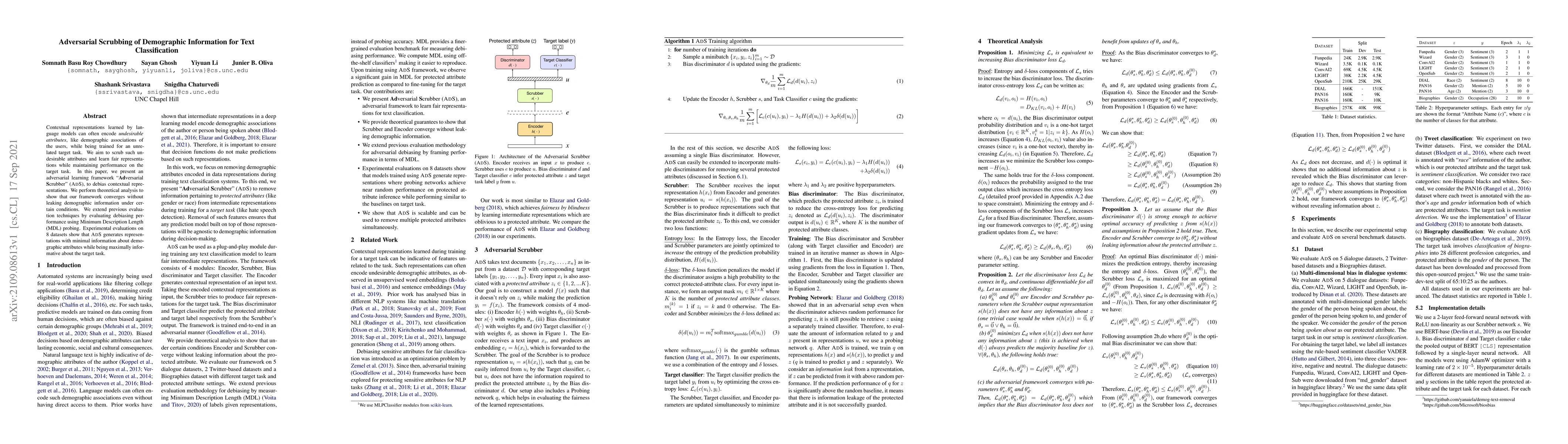 Researchers developed an algorithm called Adversarial Scrubber to remove unwanted demographic information from language models' representations while maintaining their performance on target tasks. Experimental results show that the algorithm successfully debiases contextual representations across 8 datasets.