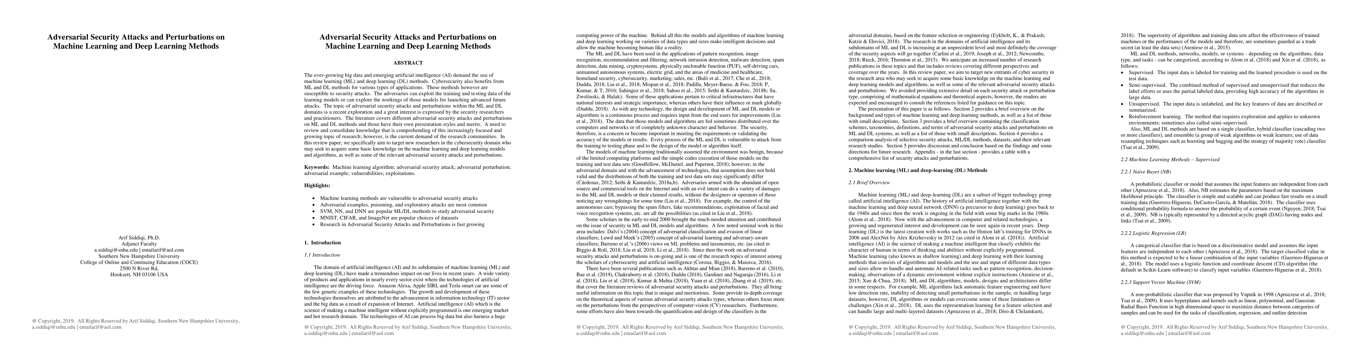 The ever-growing big data and emerging artificial intelligence (AI) demand the use of machine learning (ML) and deep learning (DL) methods. Cybersecurity also benefits from ML and DL methods for various types of applications. These methods however are susceptible to security attacks. The adversaries can exploit the training and testing data of the learning models or can explore the workings of those models for launching advanced future attacks. The topic of adversarial security attacks and perturbations within the ML and DL domains is a recent exploration and a great interest is expressed by the security researchers and practitioners. The literature covers different adversarial security attacks and perturbations on ML and DL methods and those have their own presentation styles and merits. A need to review and consolidate knowledge that is comprehending of this increasingly focused and growing topic of research; however, is the current demand of the research communities. In this review paper, we specifically aim to target new researchers in the cybersecurity domain who may seek to acquire some basic knowledge on the machine learning and deep learning models and algorithms, as well as some of the relevant adversarial security attacks and perturbations.