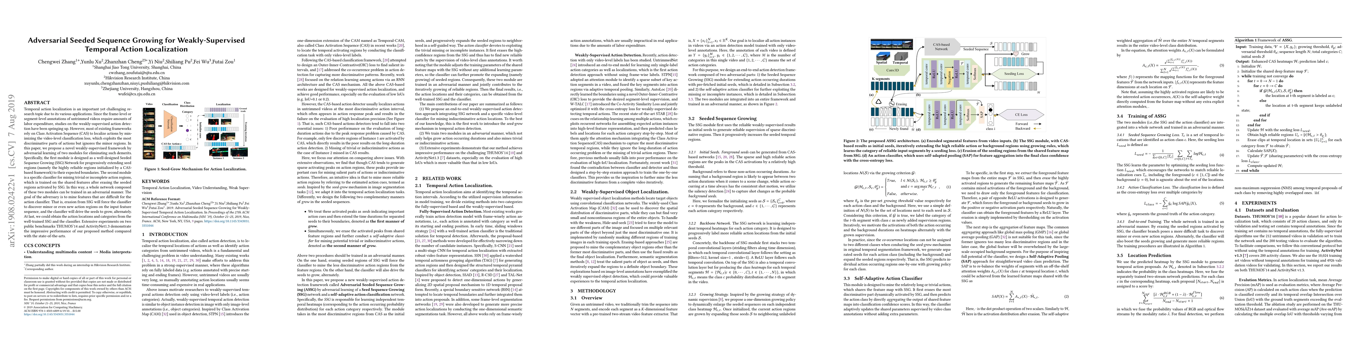 Temporal action localization is an important yet challenging research topic due to its various applications. Since the frame-level or segment-level annotations of untrimmed videos require amounts of labor expenditure, studies on the weakly-supervised action detection have been springing up. However, most of existing frameworks rely on Class Activation Sequence (CAS) to localize actions by minimizing the video-level classification loss, which exploits the most discriminative parts of actions but ignores the minor regions. In this paper, we propose a novel weakly-supervised framework by adversarial learning of two modules for eliminating such demerits. Specifically, the first module is designed as a well-designed Seeded Sequence Growing (SSG) Network for progressively extending seed regions (namely the highly reliable regions initialized by a CAS-based framework) to their expected boundaries. The second module is a specific classifier for mining trivial or incomplete action regions, which is trained on the shared features after erasing the seeded regions activated by SSG. In this way, a whole network composed of these two modules can be trained in an adversarial manner. The goal of the adversary is to mine features that are difficult for the action classifier. That is, erasion from SSG will force the classifier to discover minor or even new action regions on the input feature sequence, and the classifier will drive the seeds to grow, alternately. At last, we could obtain the action locations and categories from the well-trained SSG and the classifier. Extensive experiments on two public benchmarks THUMOS'14 and ActivityNet1.3 demonstrate the impressive performance of our proposed method compared with the state-of-the-arts.