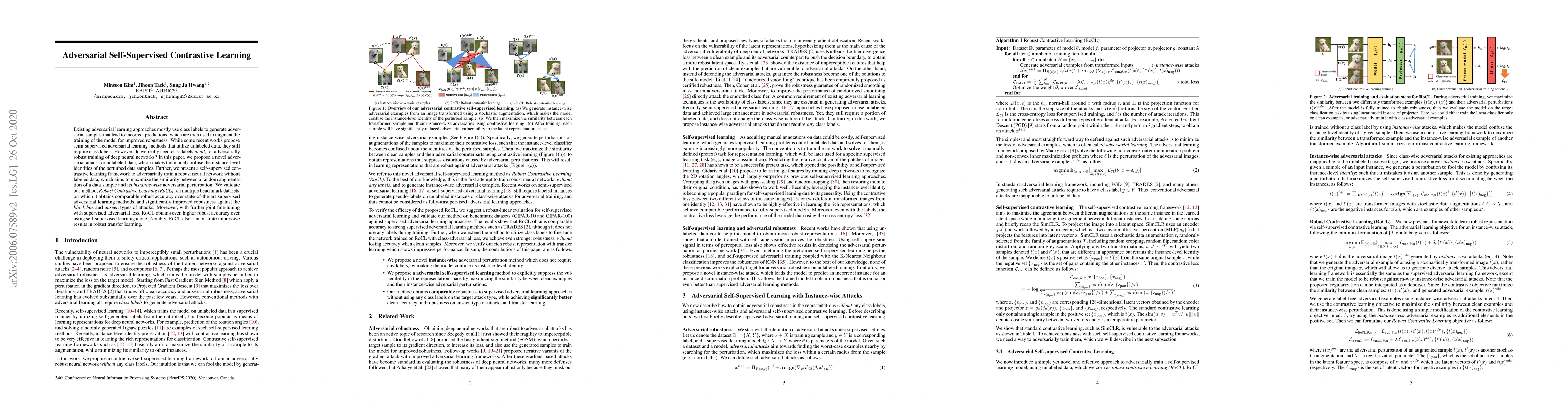 This paper proposes a novel adversarial attack for unlabeled data, making models confuse instance-level identities of perturbed data samples. It introduces a self-supervised contrastive learning framework, Robust Contrastive Learning (RoCL), to adversarially train a robust neural network without labeled data, maximizing similarity between a random augmentation of a data sample and its instance-wise adversarial perturbation.