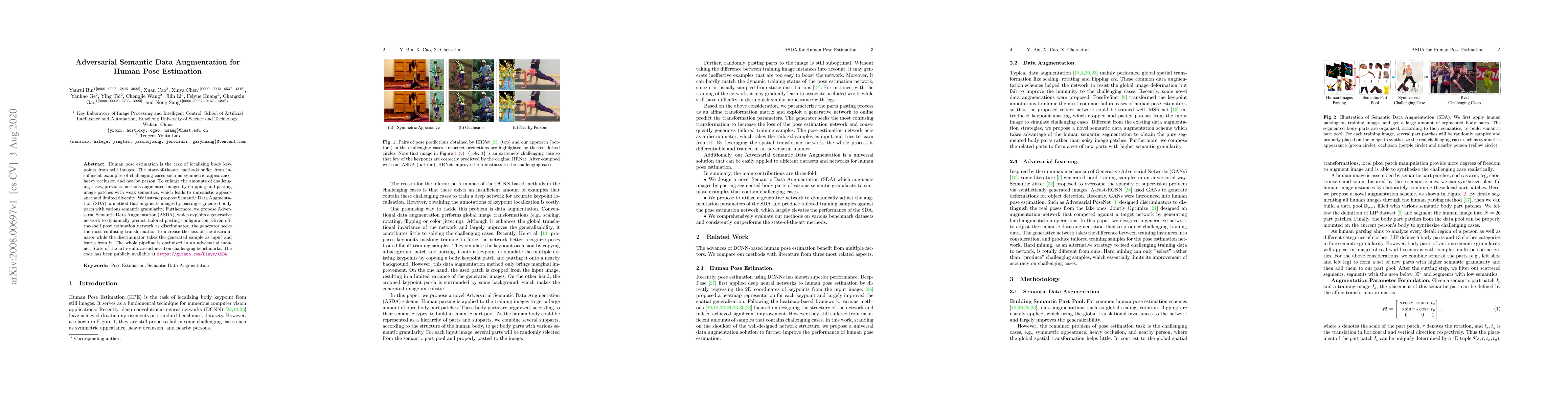 This paper proposes Semantic Data Augmentation (SDA) and Adversarial Semantic Data Augmentation (ASDA) to enhance human pose estimation by generating more realistic and diverse training samples. ASDA uses a generative network to dynamically predict tailored pasting configurations, optimizing the process in an adversarial manner to confuse the pose estimation network, thereby improving performance on challenging benchmarks.