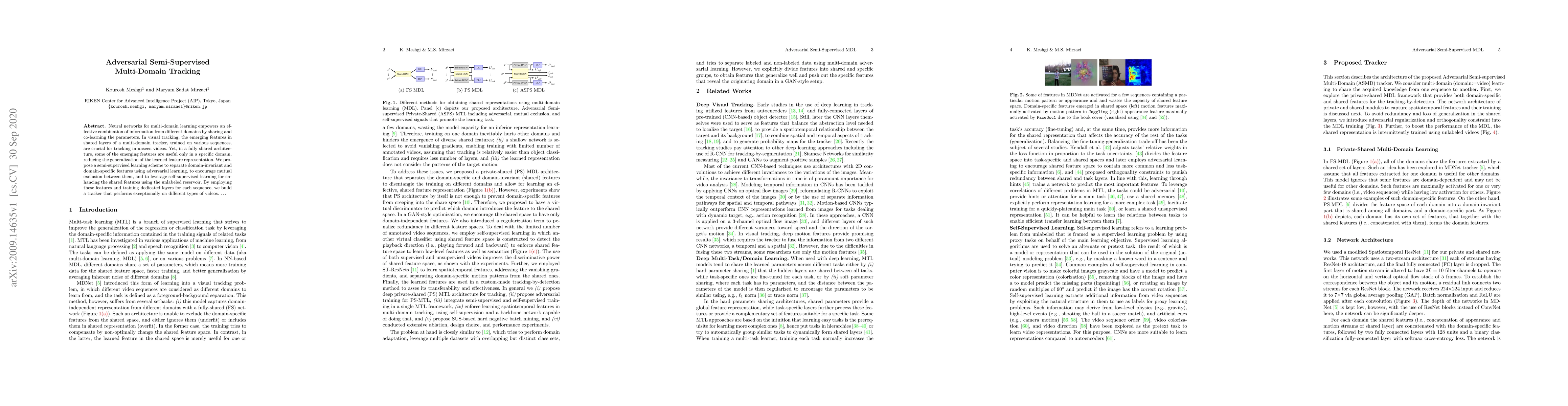 Neural networks for multi-domain learning empowers an effective combination of information from different domains by sharing and co-learning the parameters. In visual tracking, the emerging features in shared layers of a multi-domain tracker, trained on various sequences, are crucial for tracking in unseen videos. Yet, in a fully shared architecture, some of the emerging features are useful only in a specific domain, reducing the generalization of the learned feature representation. We propose a semi-supervised learning scheme to separate domain-invariant and domain-specific features using adversarial learning, to encourage mutual exclusion between them, and to leverage self-supervised learning for enhancing the shared features using the unlabeled reservoir. By employing these features and training dedicated layers for each sequence, we build a tracker that performs exceptionally on different types of videos.