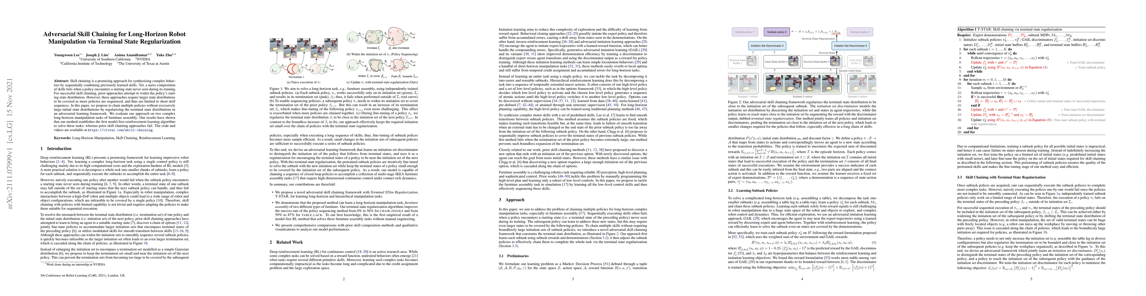 This paper proposes an adversarial learning framework for skill chaining in long-horizon robot manipulation tasks, using terminal state regularization to avoid the need for excessively large initial state distributions. The approach successfully enables model-free reinforcement learning to solve complex furniture assembly tasks where previous methods fail.