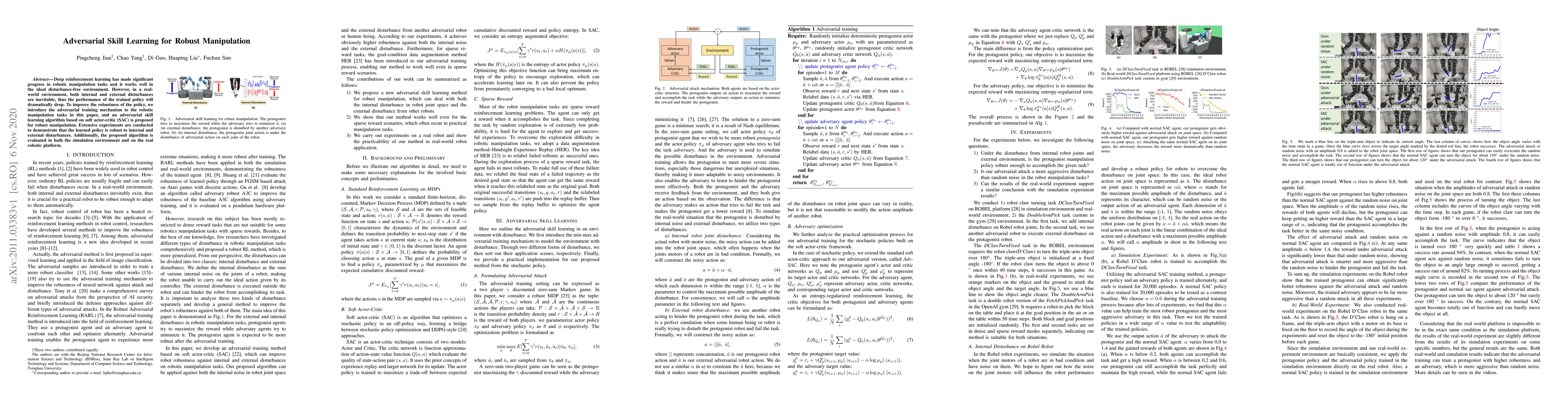 This paper proposes an adversarial skill learning algorithm based on soft actor-critic (SAC) to enhance the robustness of deep reinforcement learning in robotic manipulation tasks. The method effectively mitigates performance drops due to internal and external disturbances, as demonstrated through extensive experiments in both simulation and real-world robotic environments.