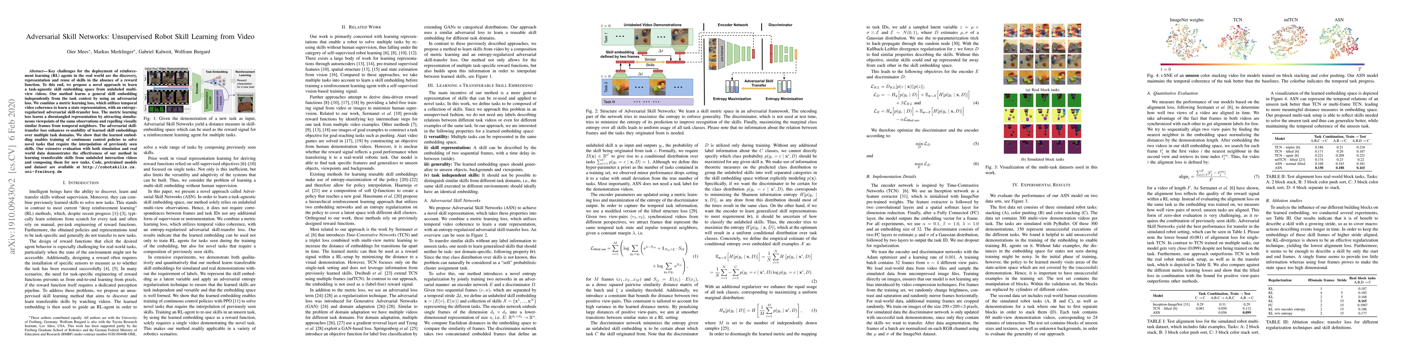 Key challenges for the deployment of reinforcement learning (RL) agents in the real world are the discovery, representation and reuse of skills in the absence of a reward function. To this end, we propose a novel approach to learn a task-agnostic skill embedding space from unlabeled multi-view videos. Our method learns a general skill embedding independently from the task context by using an adversarial loss. We combine a metric learning loss, which utilizes temporal video coherence to learn a state representation, with an entropy regularized adversarial skill-transfer loss. The metric learning loss learns a disentangled representation by attracting simultaneous viewpoints of the same observations and repelling visually similar frames from temporal neighbors. The adversarial skill-transfer loss enhances re-usability of learned skill embeddings over multiple task domains. We show that the learned embedding enables training of continuous control policies to solve novel tasks that require the interpolation of previously seen skills. Our extensive evaluation with both simulation and real world data demonstrates the effectiveness of our method in learning transferable skills from unlabeled interaction videos and composing them for new tasks. Code, pretrained models and dataset are available at http://robotskills.cs.uni-freiburg.de