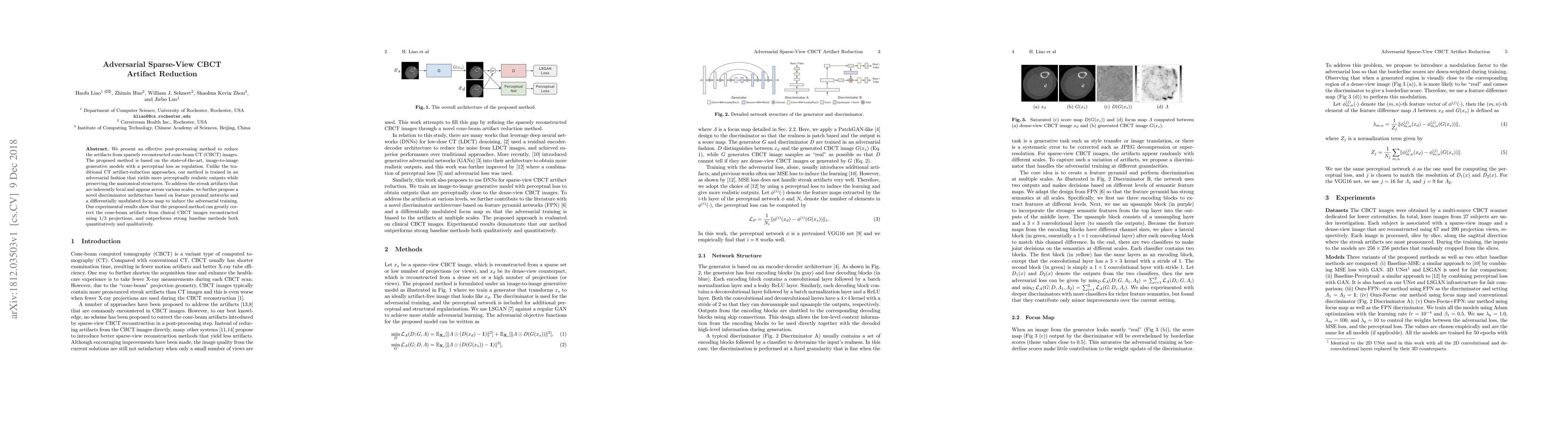 This paper proposes an adversarial training method using generative models to reduce artifacts in sparse-view CBCT images. The method employs a perceptual loss and a novel discriminator architecture to enhance artifact correction while preserving anatomical details, outperforming existing baselines.
