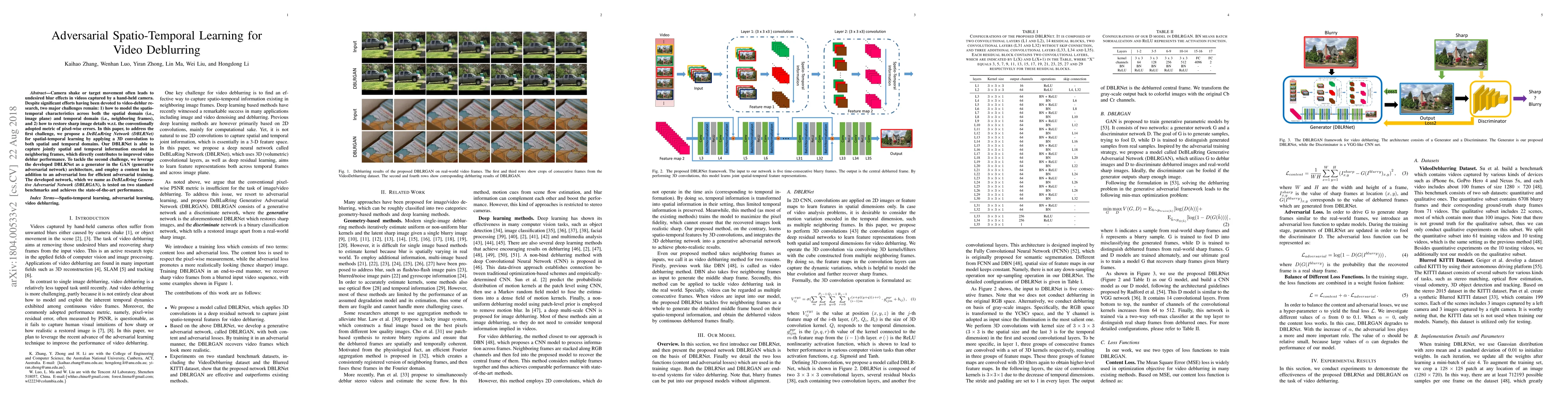 This paper proposes a DeBLuRring Network (DBLRNet) using 3D convolution for spatio-temporal learning to model blur in videos, and integrates it into a DeBLuRring Generative Adversarial Network (DBLRGAN) to restore sharp details, achieving state-of-the-art performance on standard benchmarks.