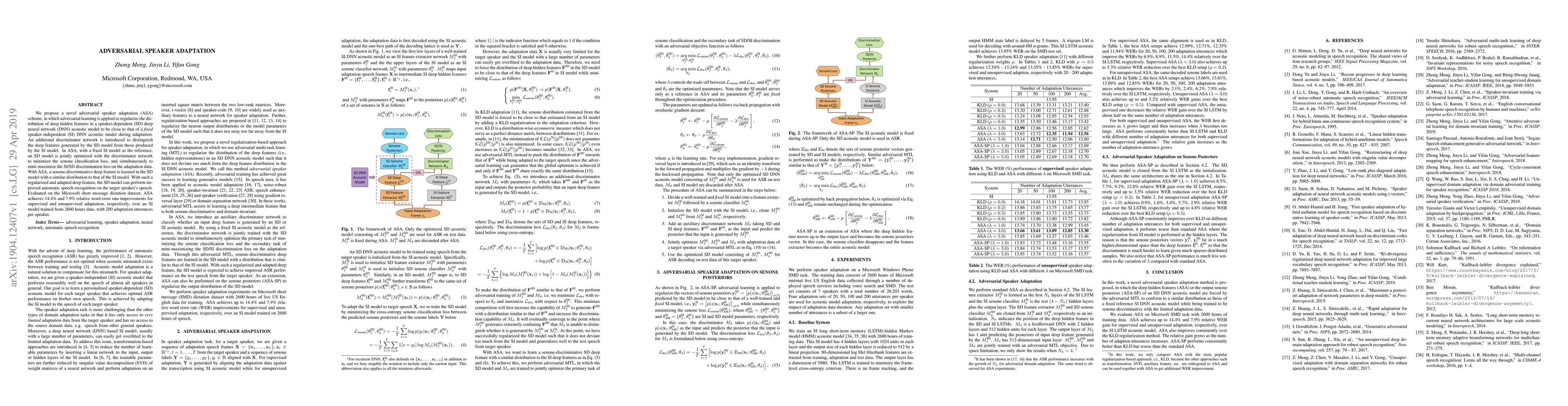 A new speaker adaptation technique called Adversarial Speaker Adaptation improves automatic speech recognition by adapting a speaker-dependent model to match a fixed speaker-independent model, achieving significant improvements in word error rate on the Microsoft short message dictation dataset.