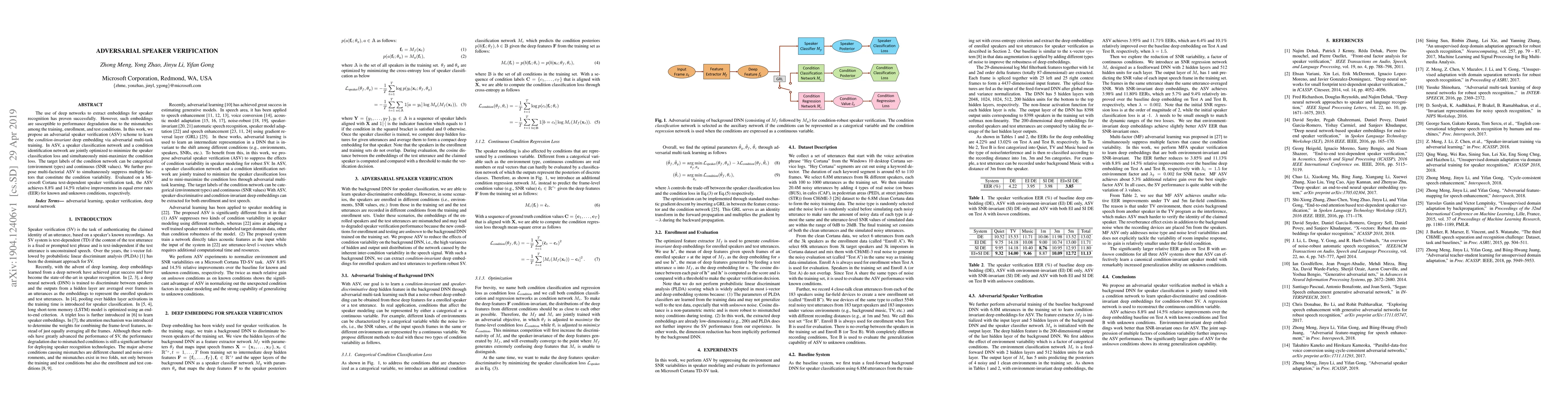 This paper proposes an adversarial speaker verification scheme to create condition-invariant embeddings for speaker recognition, achieving significant improvements in equal error rates under varied conditions. The method uses adversarial multi-task training to optimize both speaker classification and condition identification networks.