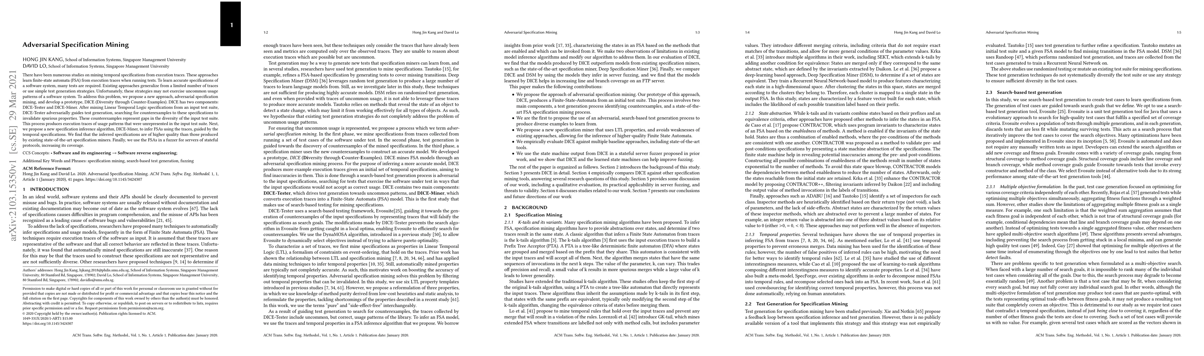 Adversarial Specification Mining introduces DICE, a system that enhances the discovery of accurate software specifications by generating diverse test cases to uncover uncommon usage patterns, leading to higher quality finite-state automata compared to existing methods. DICE's components, DICE-Tester and DICE-Miner, collaboratively refine specifications and improve protocol server fuzzer coverage.