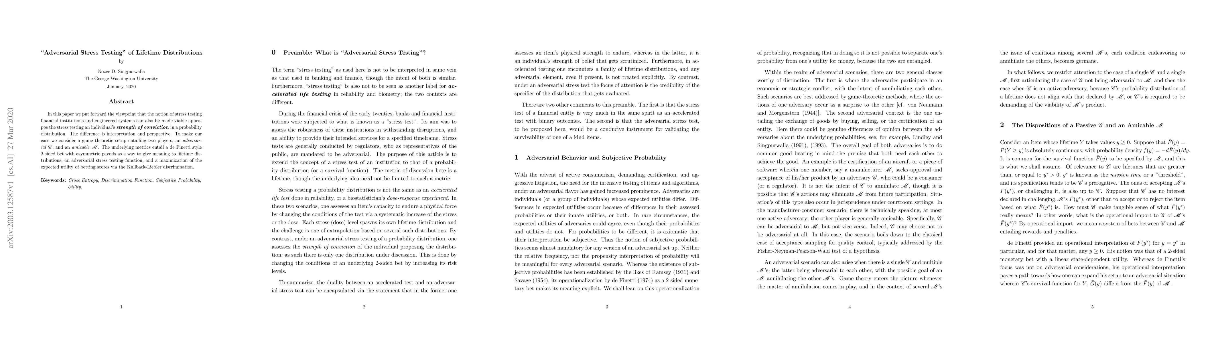 In this paper we put forward the viewpoint that the notion of stress testing financial institutions and engineered systems can also be made viable appropos the stress testing an individual's strength of conviction in a probability distribution. The difference is interpretation and perspective. To make our case we consider a game theoretic setup entailing two players, an adversarial C, and an amicable M.The underlying metrics entail a de Finetti style 2 sided bet with asymmetric payoffs as a way to give meaning to lifetime distributions, an adversarial stress testing function, and a maximization of the expected utility of betting scores via the Kullback Liebler discrimination.