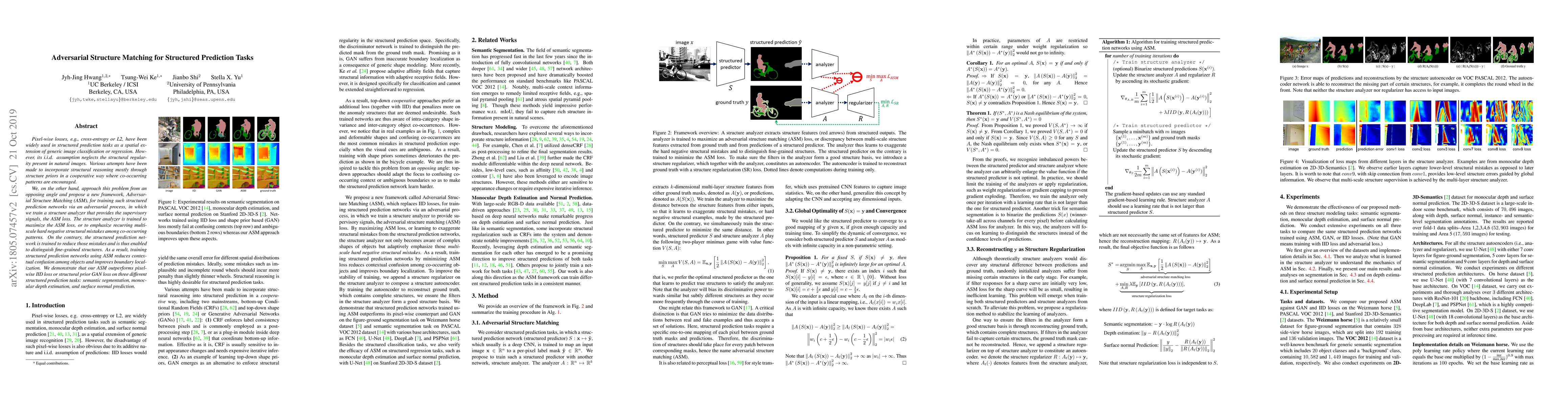 This paper introduces Adversarial Structure Matching (ASM) to improve structured prediction tasks by training a structure analyzer to highlight structural errors, which in turn helps the prediction network to better distinguish fine-grained structures, leading to improved performance in semantic segmentation, monocular depth estimation, and surface normal prediction.