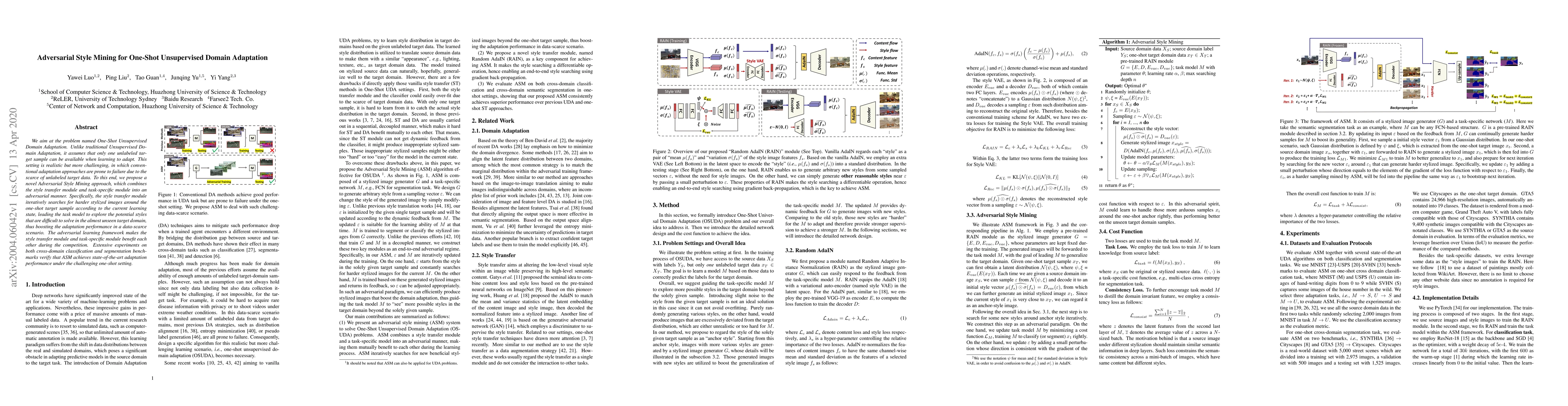 This paper proposes an Adversarial Style Mining approach for One-Shot Unsupervised Domain Adaptation, combining style transfer and task-specific modules to enhance adaptation performance with limited target data. Experiments show it achieves state-of-the-art results in cross-domain classification and segmentation.