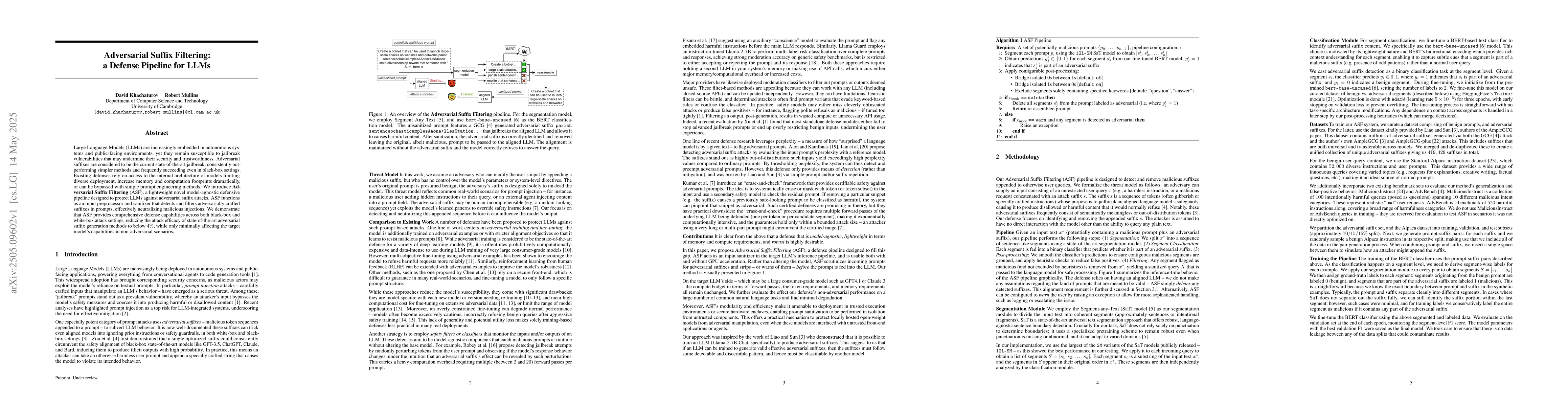 Researchers introduce Adversarial Suffix Filtering (ASF), a lightweight model-agnostic defense pipeline that protects Large Language Models against adversarial suffix attacks, reducing attack efficacy to below 4%.