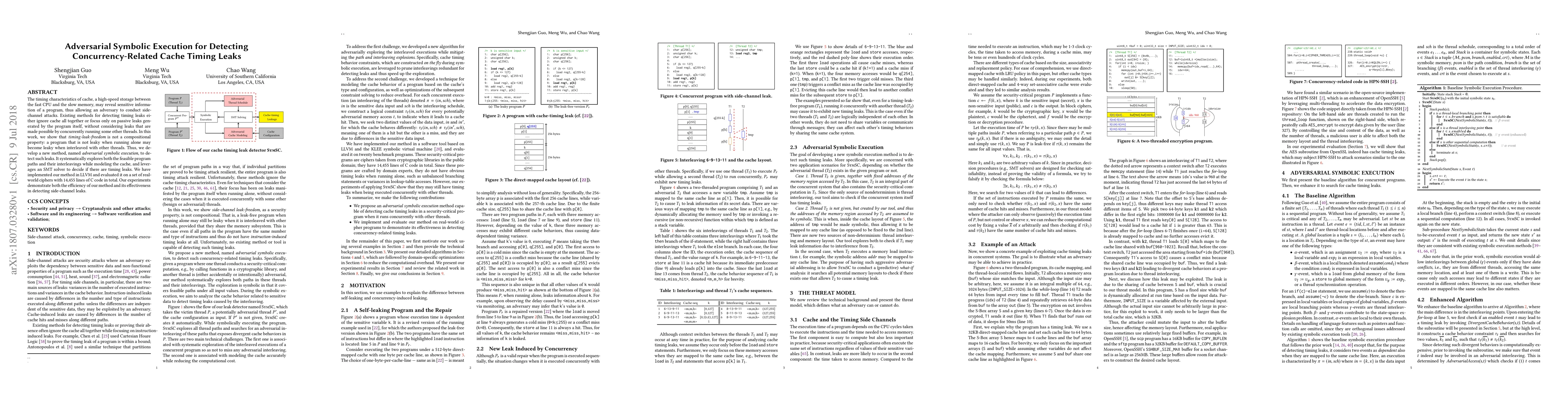 This paper introduces adversarial symbolic execution to detect concurrency-related cache timing leaks, showing that timing-leak-freedom is not compositional. The method explores program paths and interleavings, leveraging an SMT solver, and was implemented in LLVM, demonstrating efficiency and effectiveness in real-world ciphers.